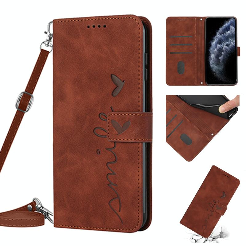 For iPhone 11 Pro Skin Feel Heart Pattern Leather Phone Case With Lanyard (Brown)