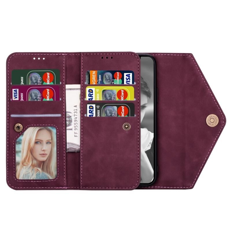 Θήκη δέρματος οριζόντιας αναδίπλωσης για iPhone 11 Pro με αίσθηση δέρματος, φερμουάρ, θήκη, υποδοχές καρτών, κορνίζα φωτογραφιών, κορδόνι και μακρύ σχοινί (Κόκκινο Κρασί)