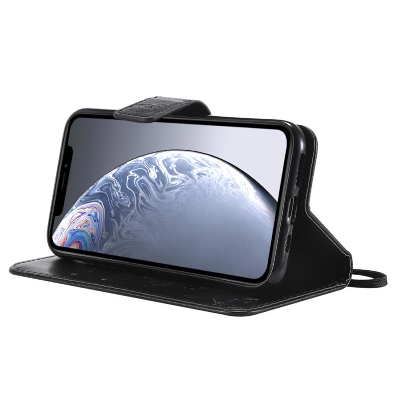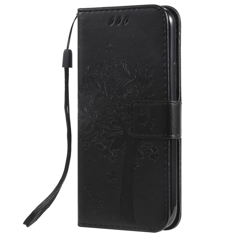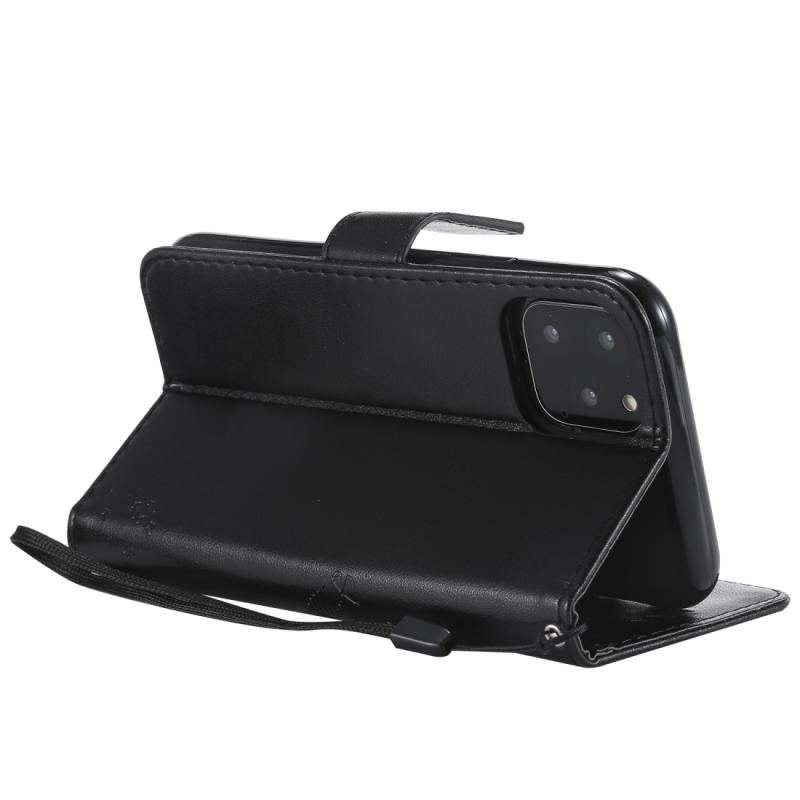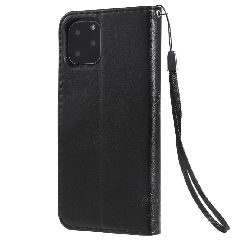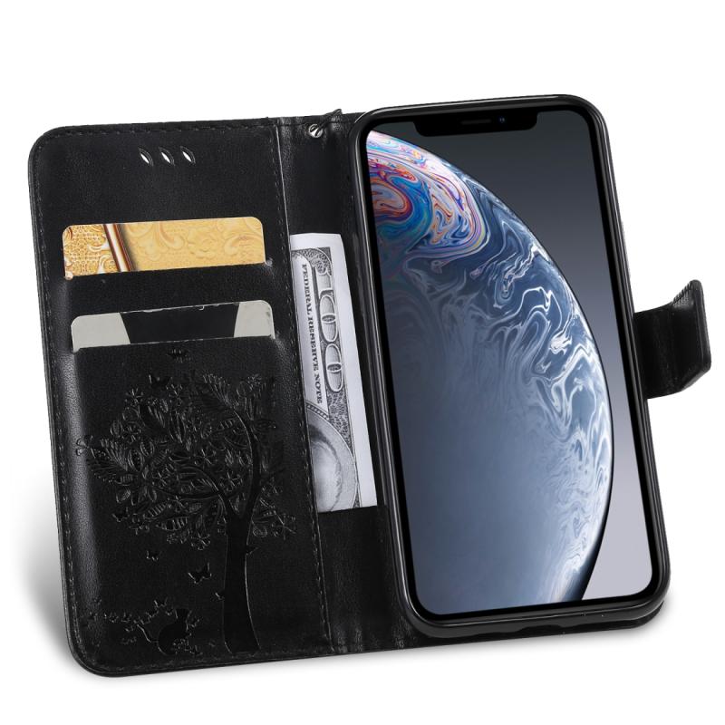 For iPhone 11 Pro Tree & Cat Pattern Pressed Printing Horizontal Flip PU Leather Case with Holder & Card Slots & Wallet & Lanyard (Black)