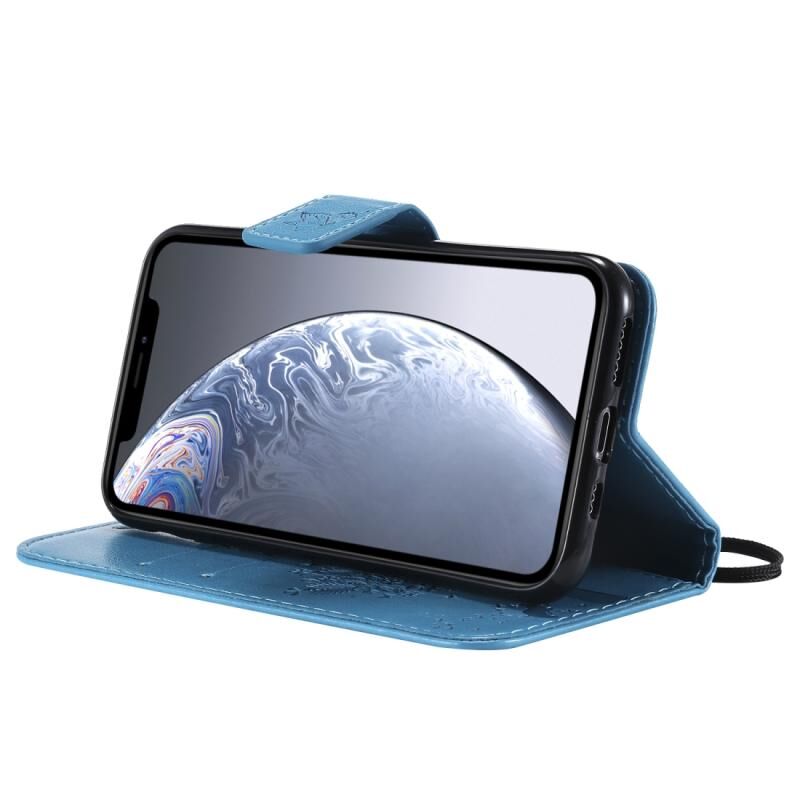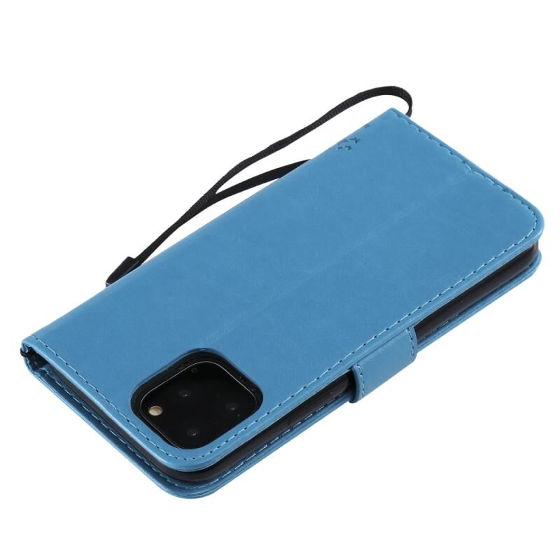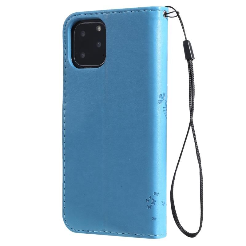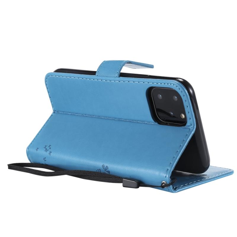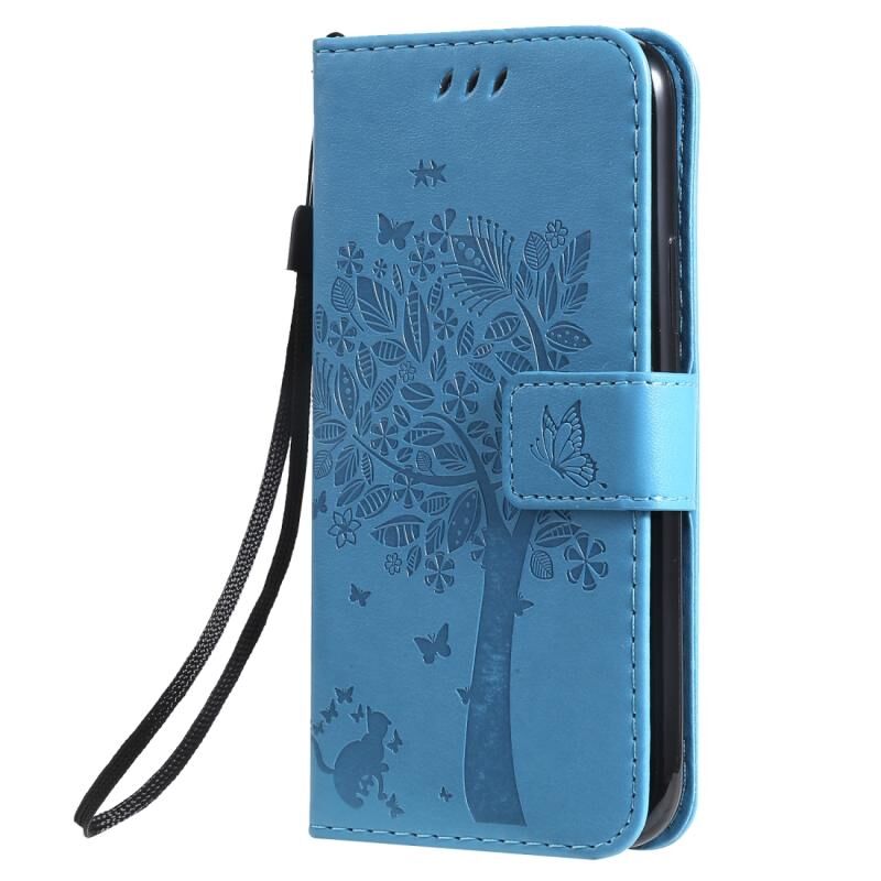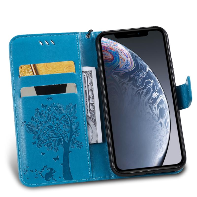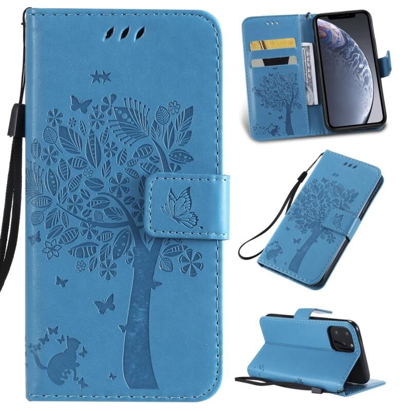 For iPhone 11 Pro Tree & Cat Pattern Pressed Printing Horizontal Flip PU Leather Case with Holder & Card Slots & Wallet & Lanyard (Blue)