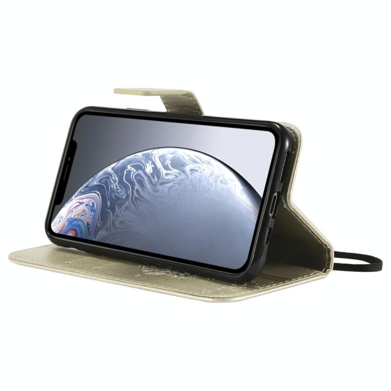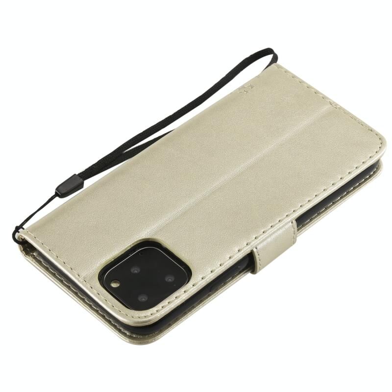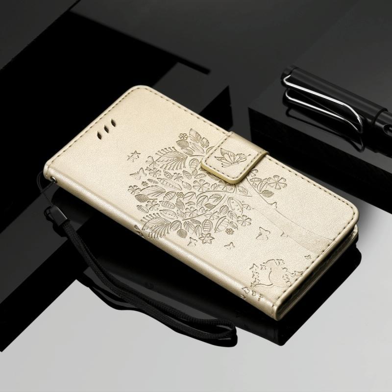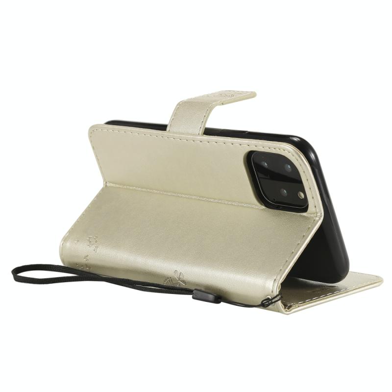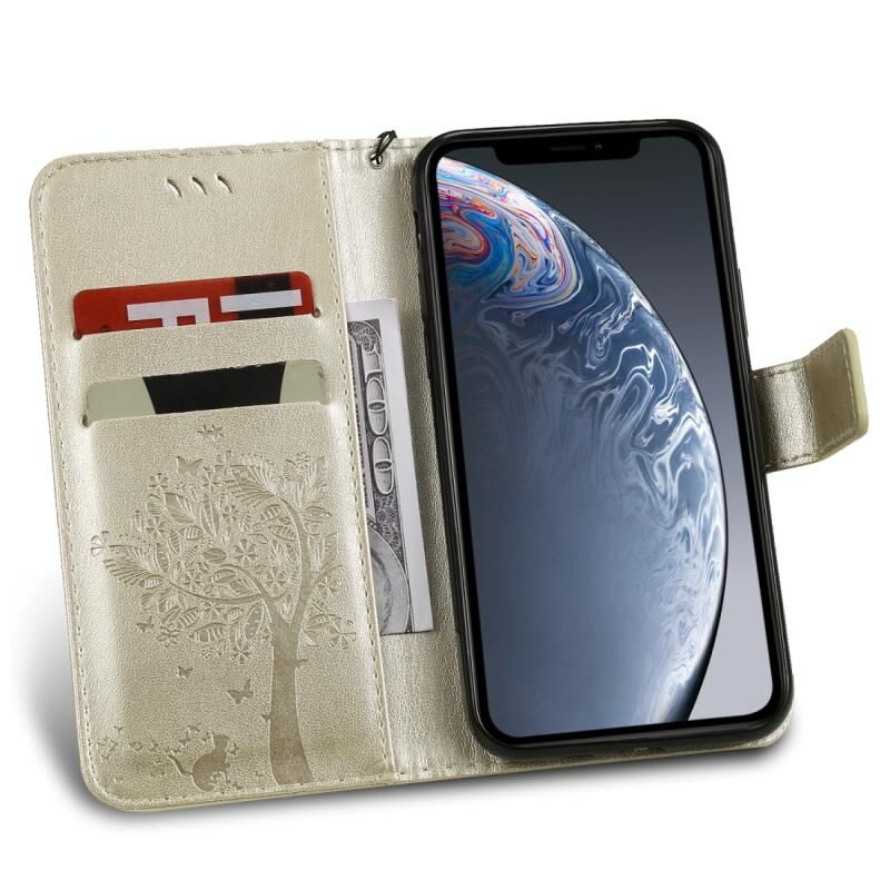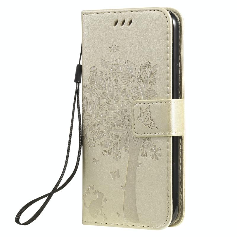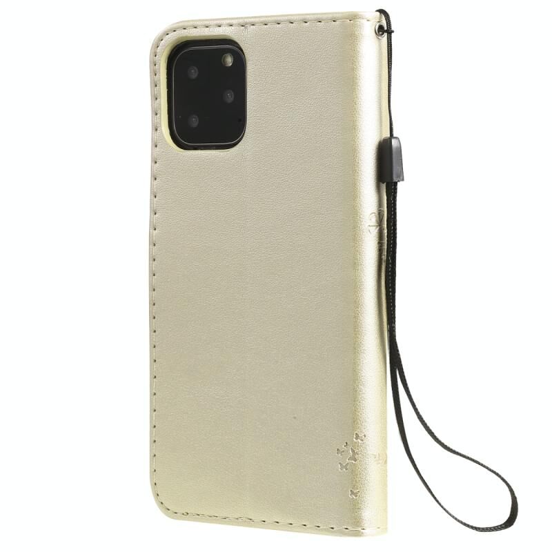 For iPhone 11 Pro Tree & Cat Pattern Pressed Printing Horizontal Flip PU Leather Case with Holder & Card Slots & Wallet & Lanyard (Gold)