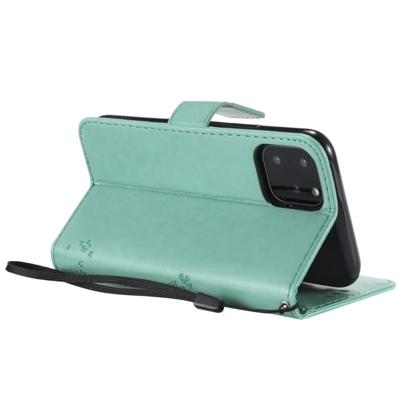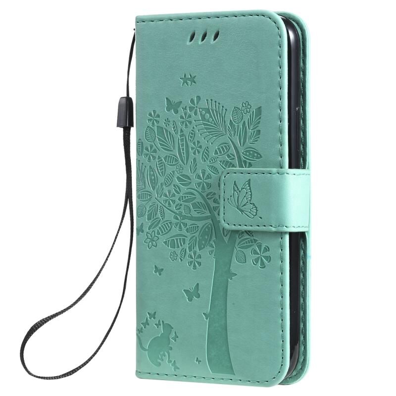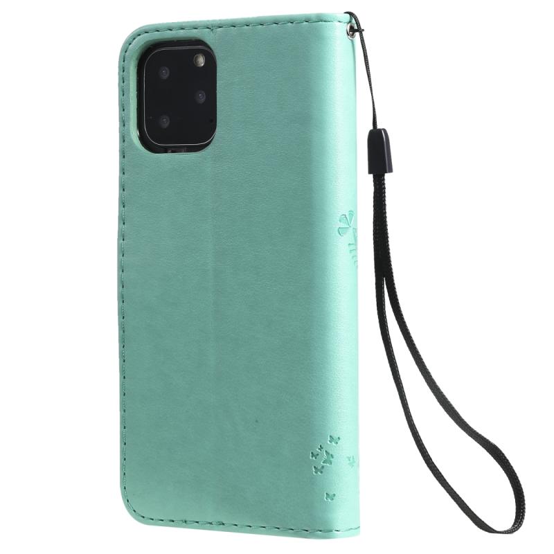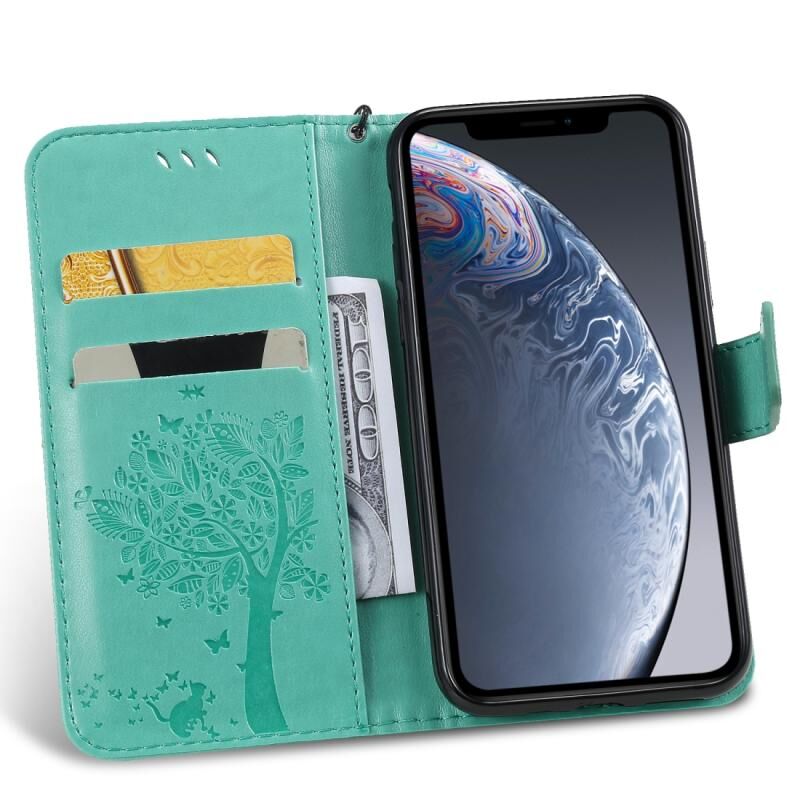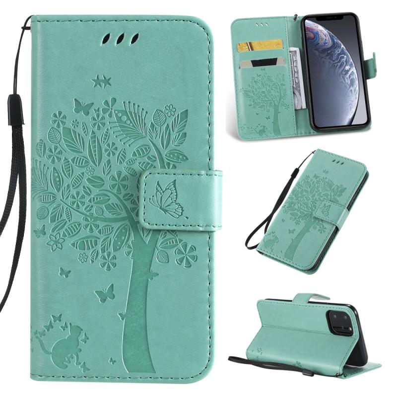 For iPhone 11 Pro Tree & Cat Pattern Pressed Printing Horizontal Flip PU Leather Case with Holder & Card Slots & Wallet & Lanyard (Green)