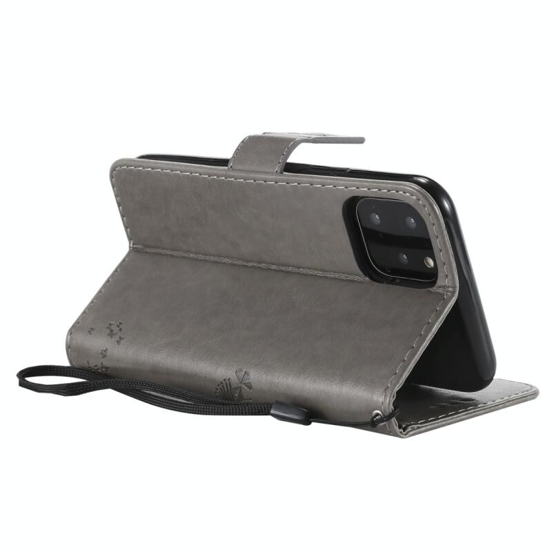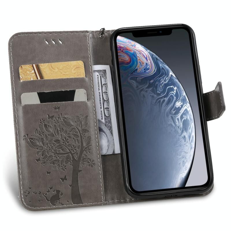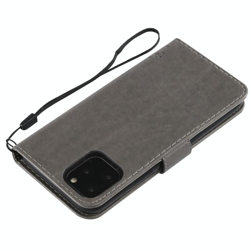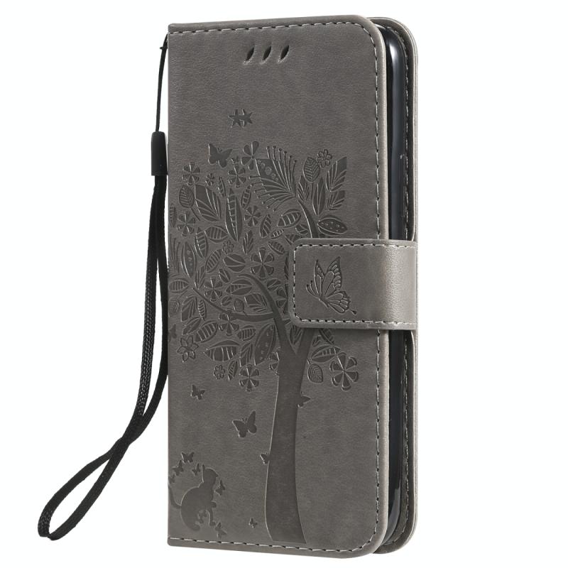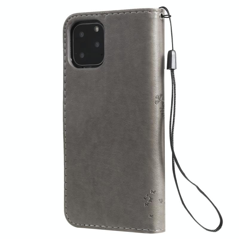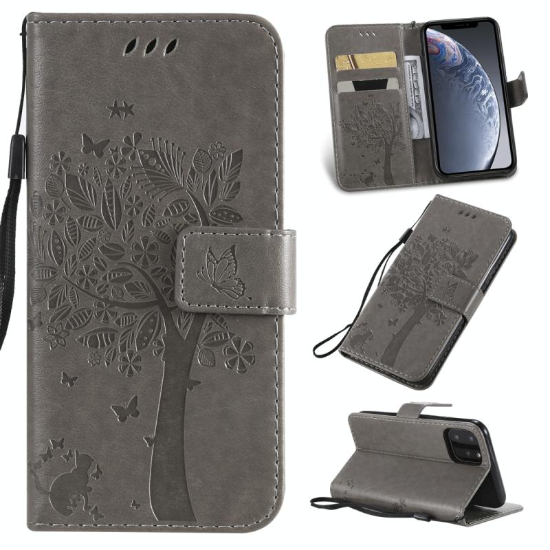 For iPhone 11 Pro Tree & Cat Pattern Pressed Printing Horizontal Flip PU Leather Case with Holder & Card Slots & Wallet & Lanyard (Grey)