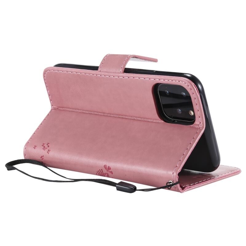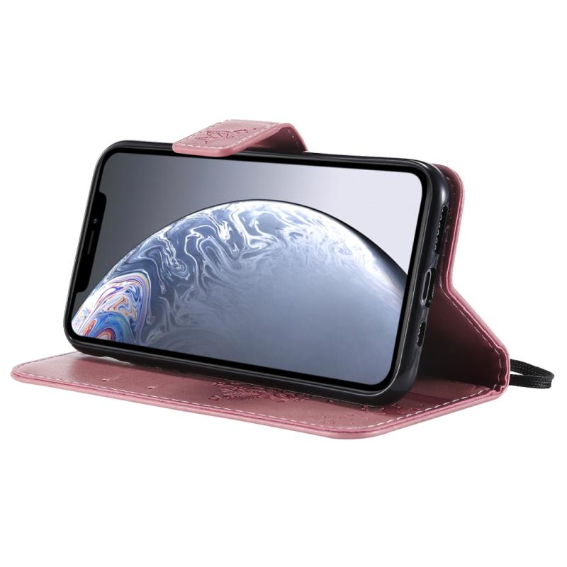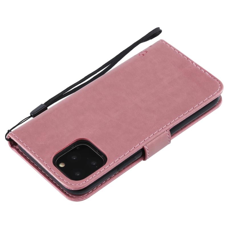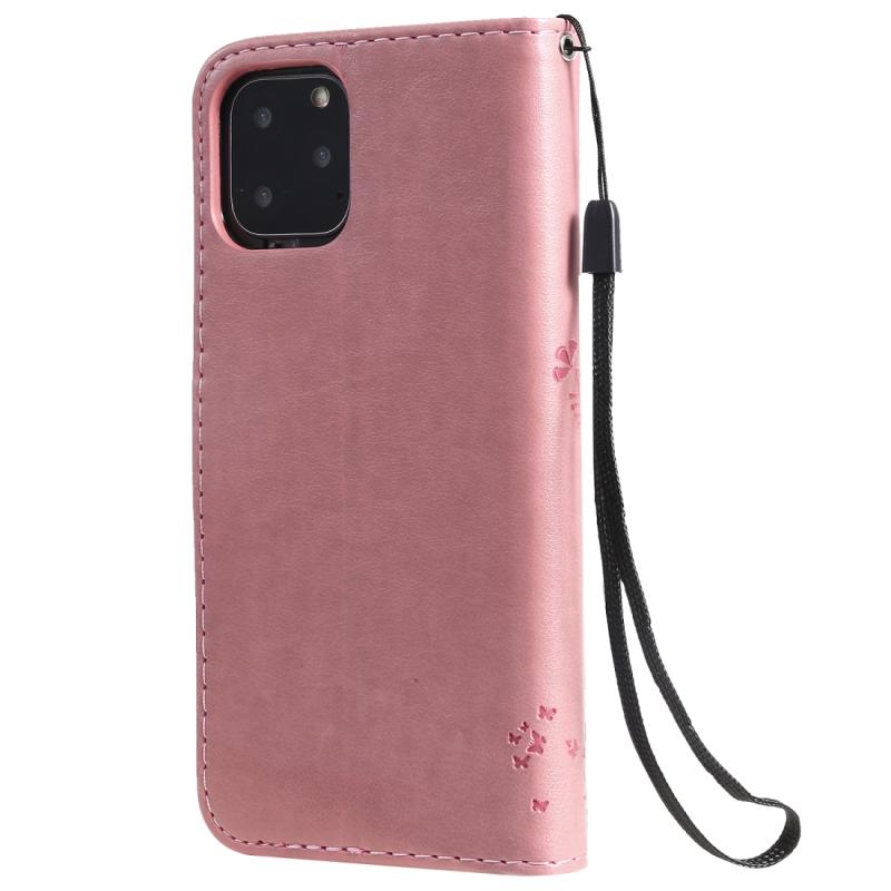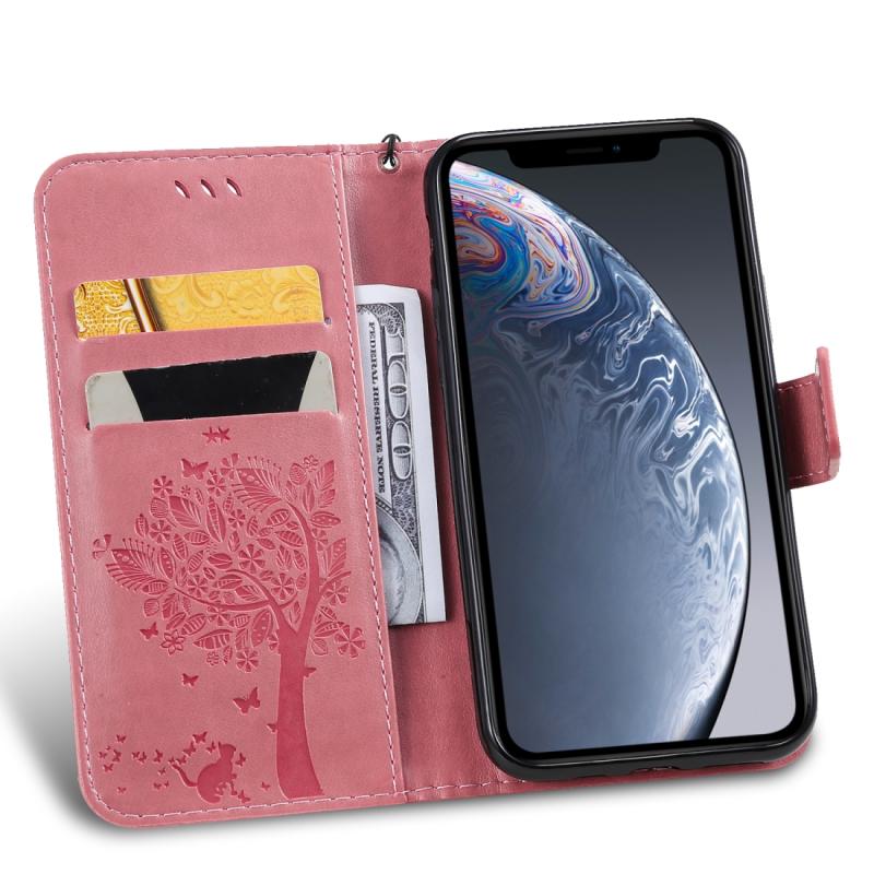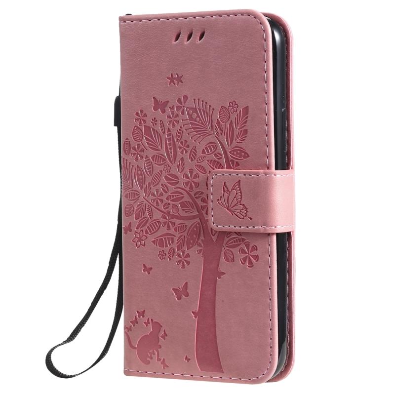 For iPhone 11 Pro Tree & Cat Pattern Pressed Printing Horizontal Flip PU Leather Case with Holder & Card Slots & Wallet & Lanyard (Pink)
