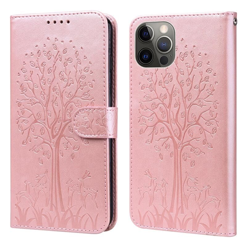 For iPhone 11 Pro Tree & Deer Pattern Pressed Printing Horizontal Flip Leather Phone Case (Pink)