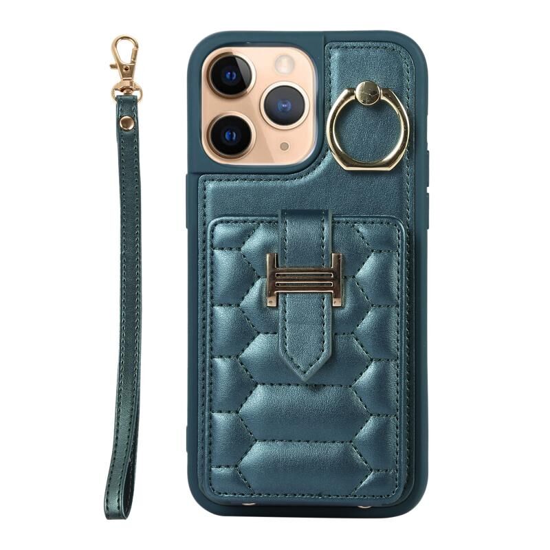 For iPhone 11 Pro Vertical Card Bag Ring Holder Phone Case with Dual Lanyard(Dark Green)