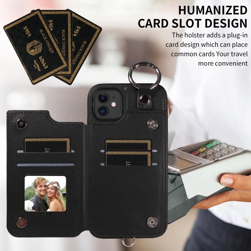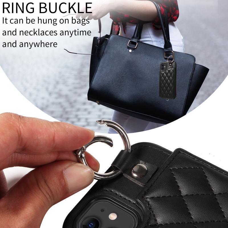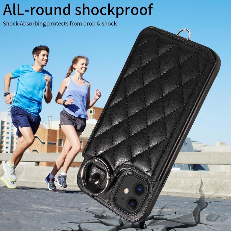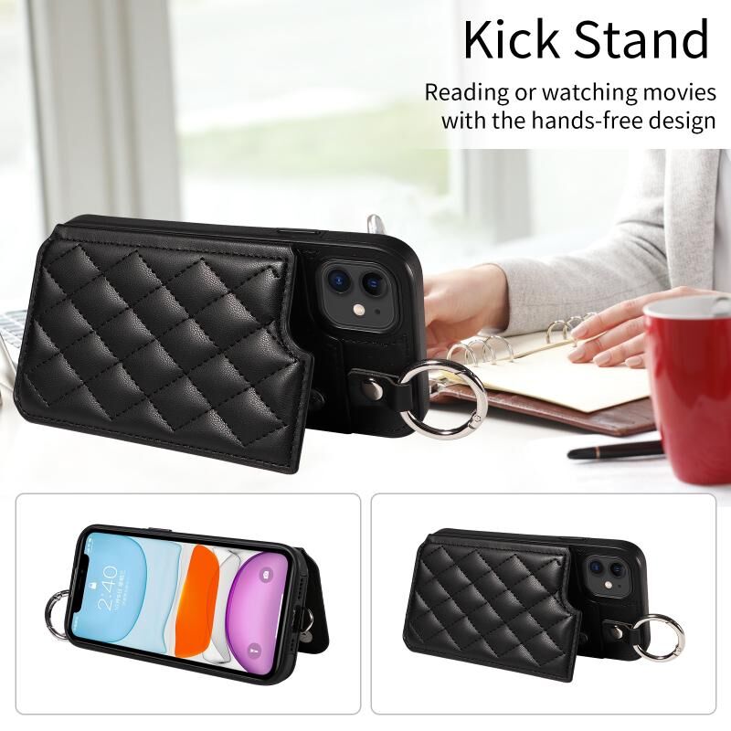 For iPhone 11 Rhombic Texture Card Bag Phone Case with Short Lanyard(Black)