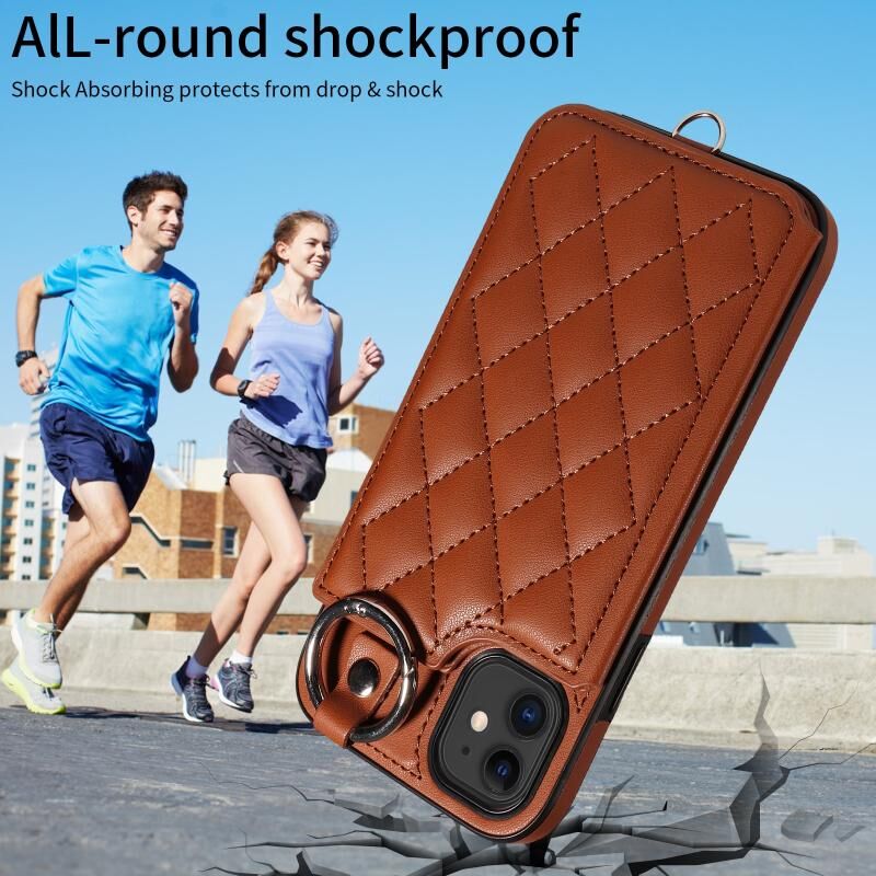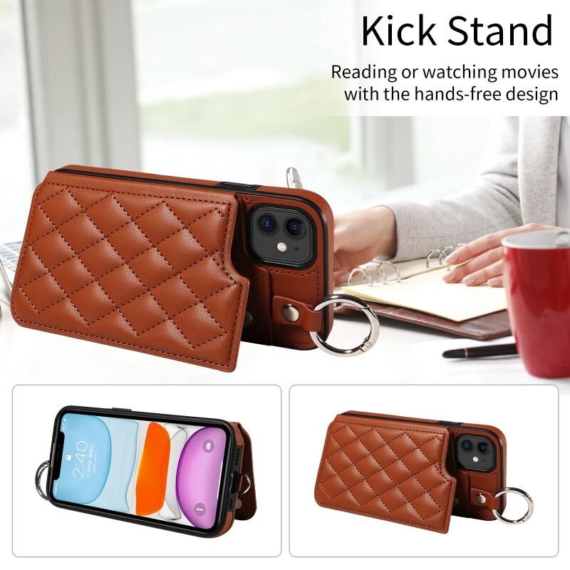 For iPhone 11 Rhombic Texture Card Bag Phone Case with Short Lanyard(Brown)