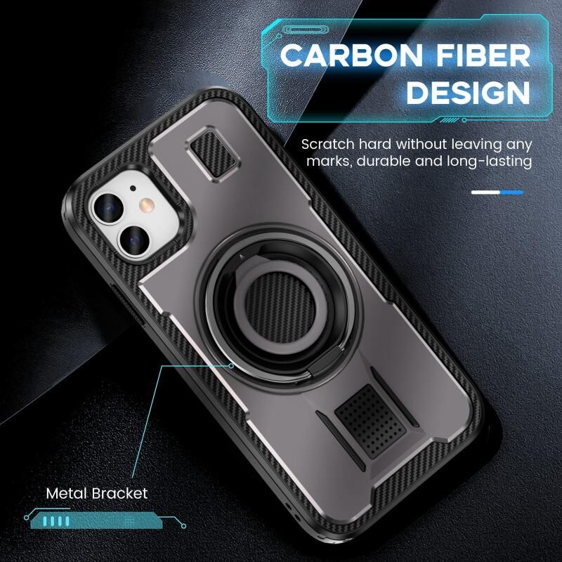 For iPhone 11 Ring Holder Carbon Fiber PC Hybrid TPU Phone Case(Grey)