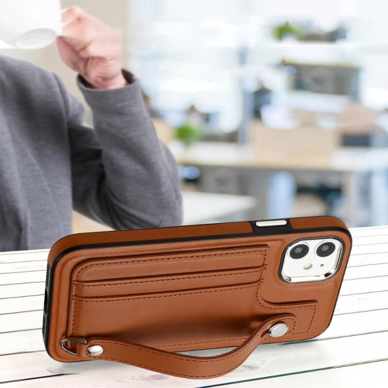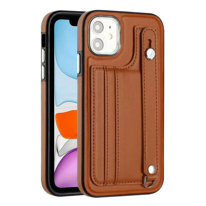 For iPhone 11 Shockproof Leather Phone Case with Wrist Strap(Brown)