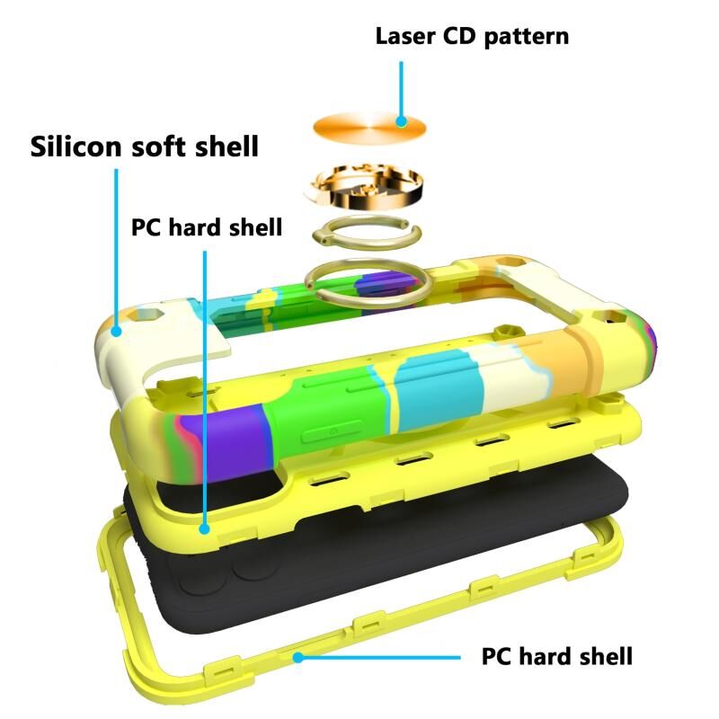 For iPhone 11 Shockproof Silicone + PC Protective Case with Dual-Ring Holder (Colorful Yellow Green)