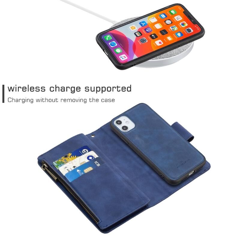 Θήκη για iPhone 11 με αίσθηση δέρματος, αποσπώμενη, μαγνητική, οριζόντια, με φερμουάρ, από δερματίνη PU, με πολλαπλές θήκες για κάρτες, βάση, πορτοφόλι, κορνίζα φωτογραφιών & λουρί (Καφέ)