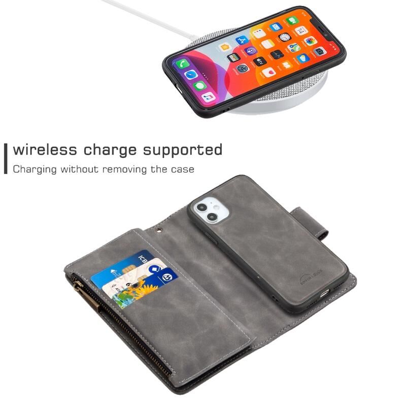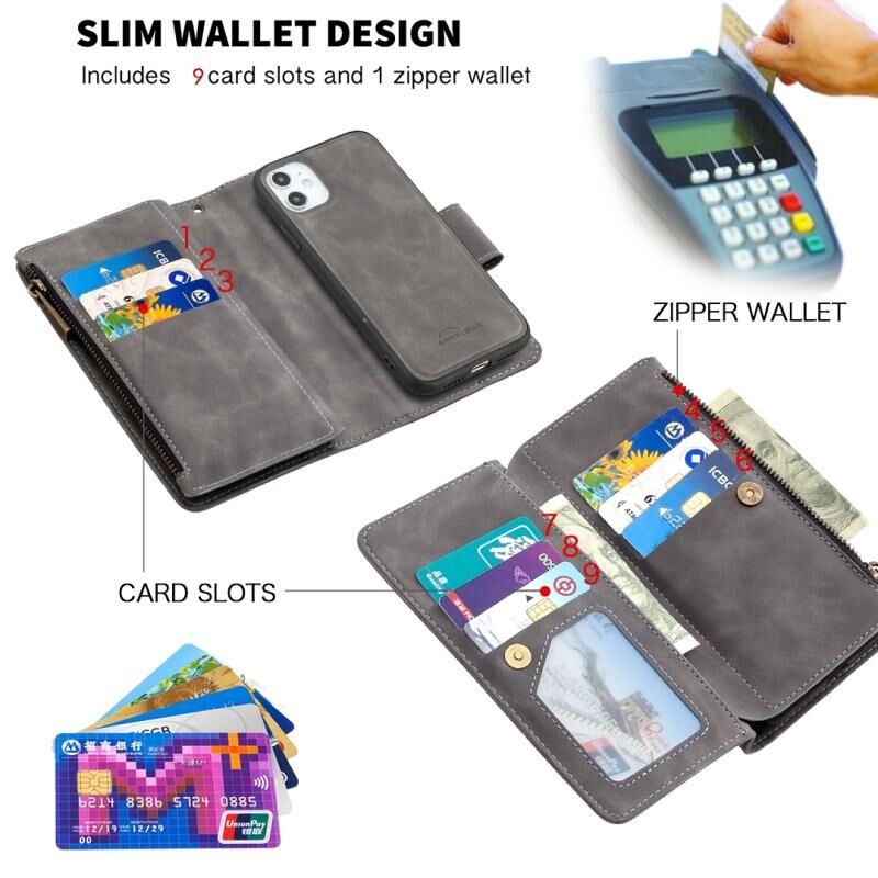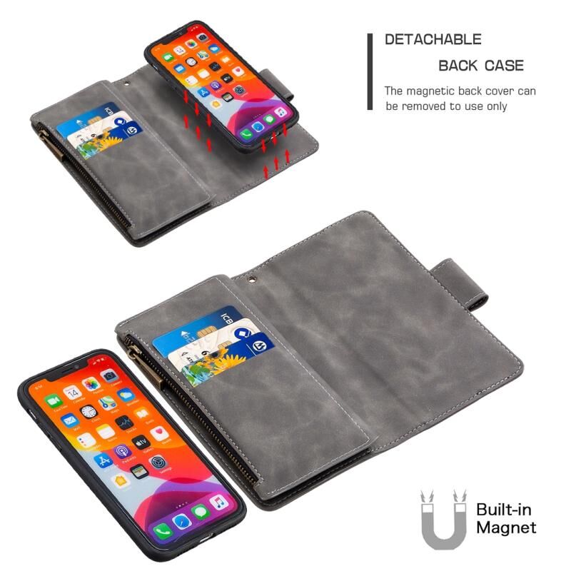 Θήκη για iPhone 11 με αίσθηση δέρματος, αποσπώμενη, μαγνητική, οριζόντια, με φερμουάρ, από δερματίνη PU, με πολλαπλές θήκες για κάρτες, βάση, πορτοφόλι, κορνίζα φωτογραφιών & λουρί (Καφέ)