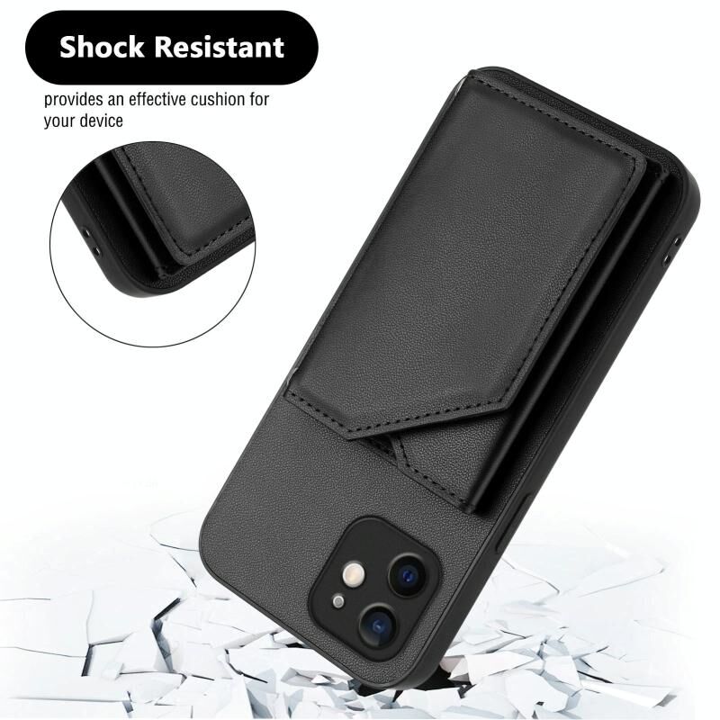 Θήκη τηλεφώνου για iPhone 11 με αίσθηση δέρματος, τέσσερις θήκες για κάρτες και λουρί καρπού (Μαύρο)