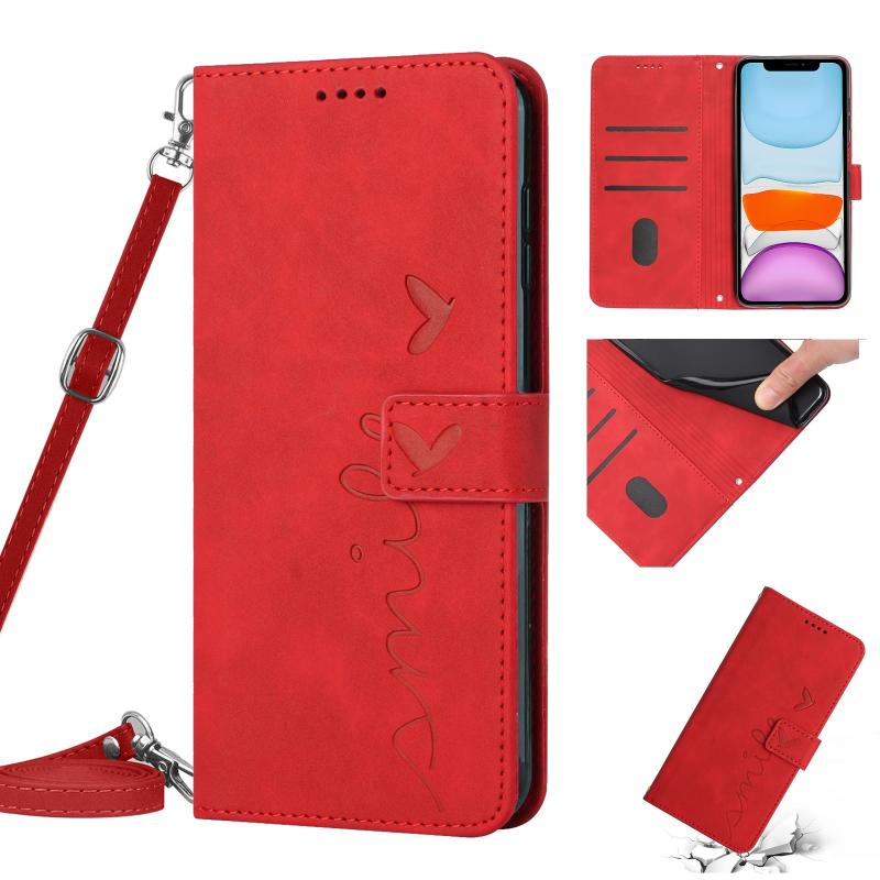For iPhone 11 Skin Feel Heart Pattern Leather Phone Case With Lanyard (Red)