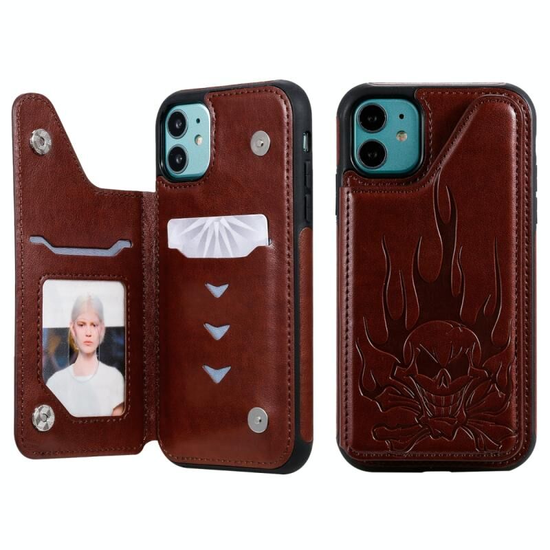 For iPhone 11 Skull Head Embossing Pattern Shockproof Protective Case with Holder & Card Slots & Wallet(Brown)