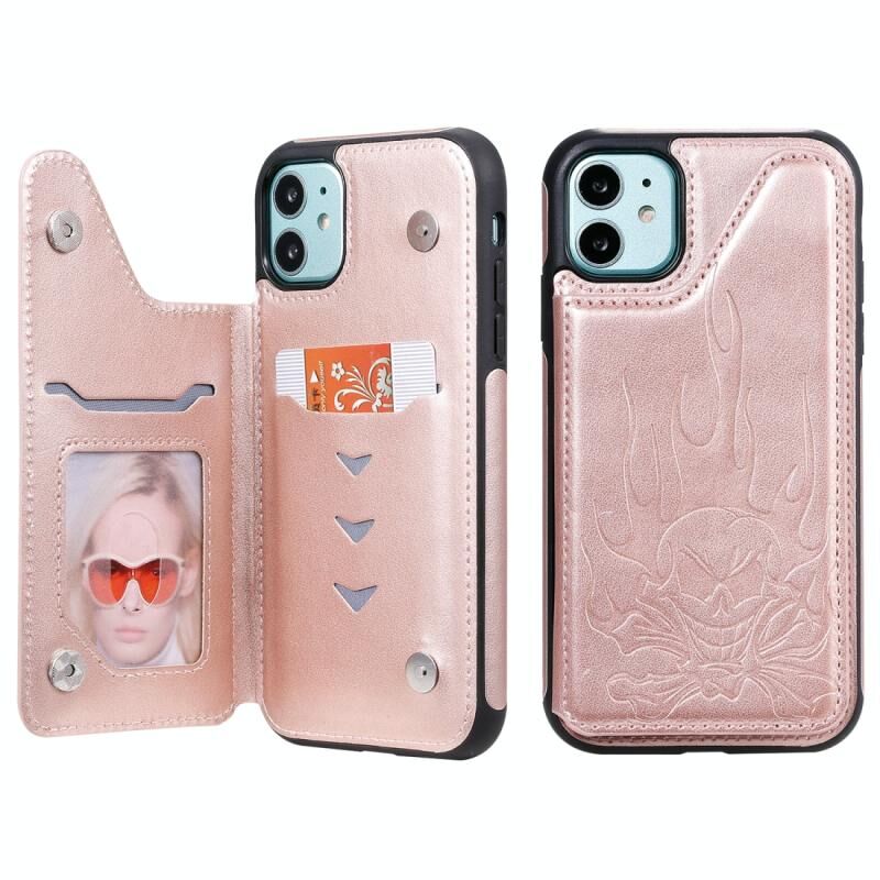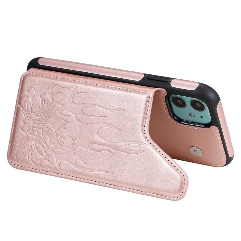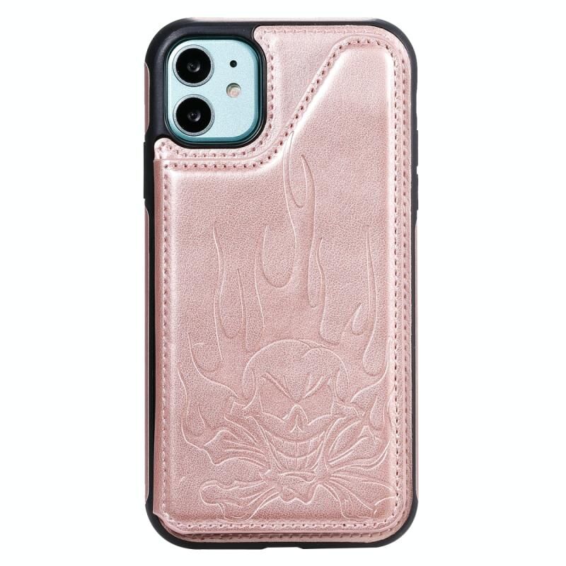 For iPhone 11 Skull Head Embossing Pattern Shockproof Protective Case with Holder & Card Slots & Wallet(Rose Gold)