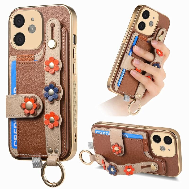 Θήκη τηλεφώνου για iPhone 11, τρισδιάστατα λουλούδια, καρδιακό λουρί χειρός, θήκη κάρτας (Μωβ)