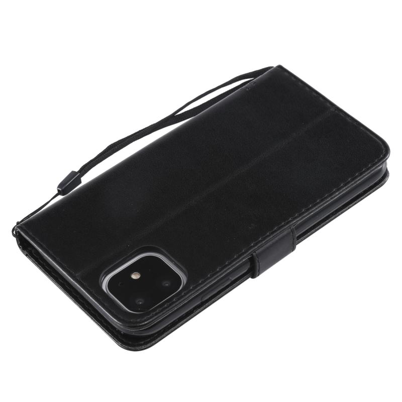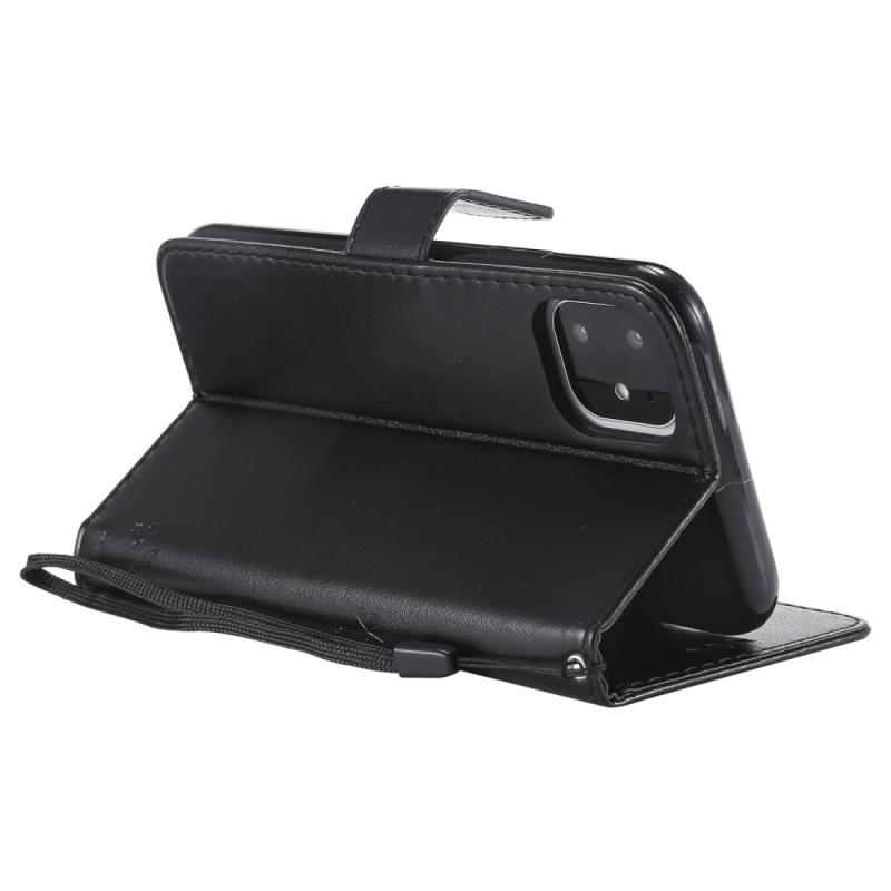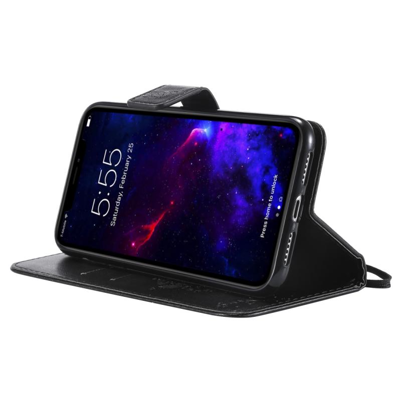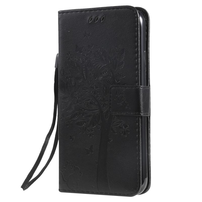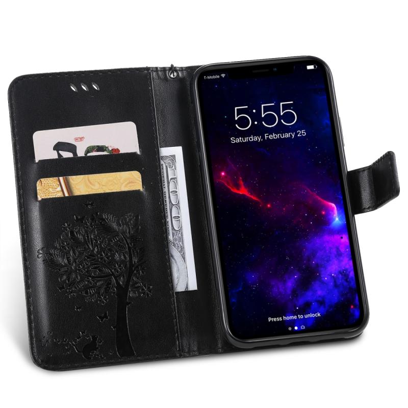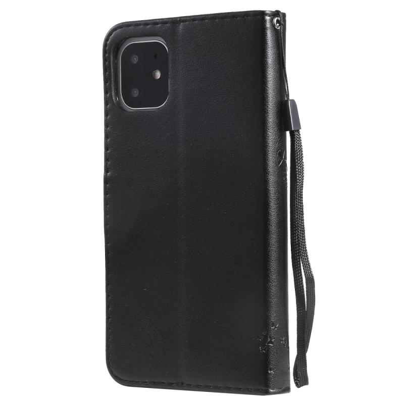 For iPhone 11 Tree & Cat Pattern Pressed Printing Horizontal Flip PU Leather Case with Holder & Card Slots & Wallet & Lanyard (Black)
