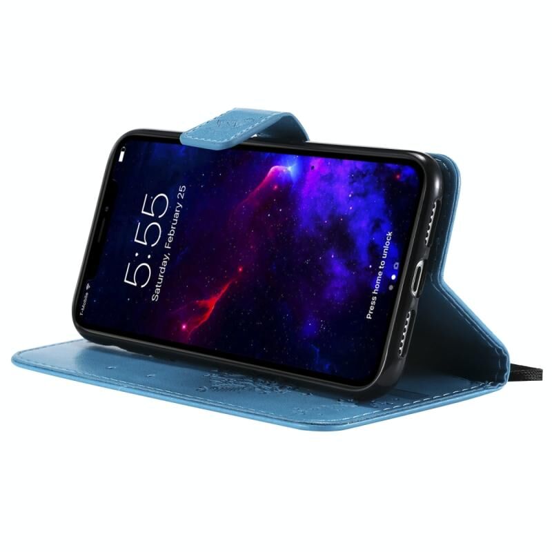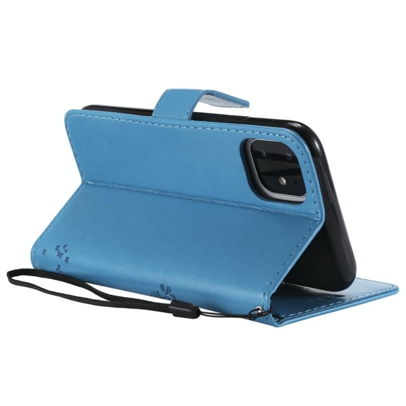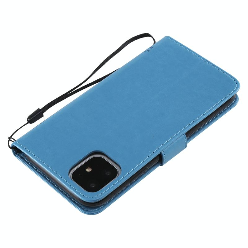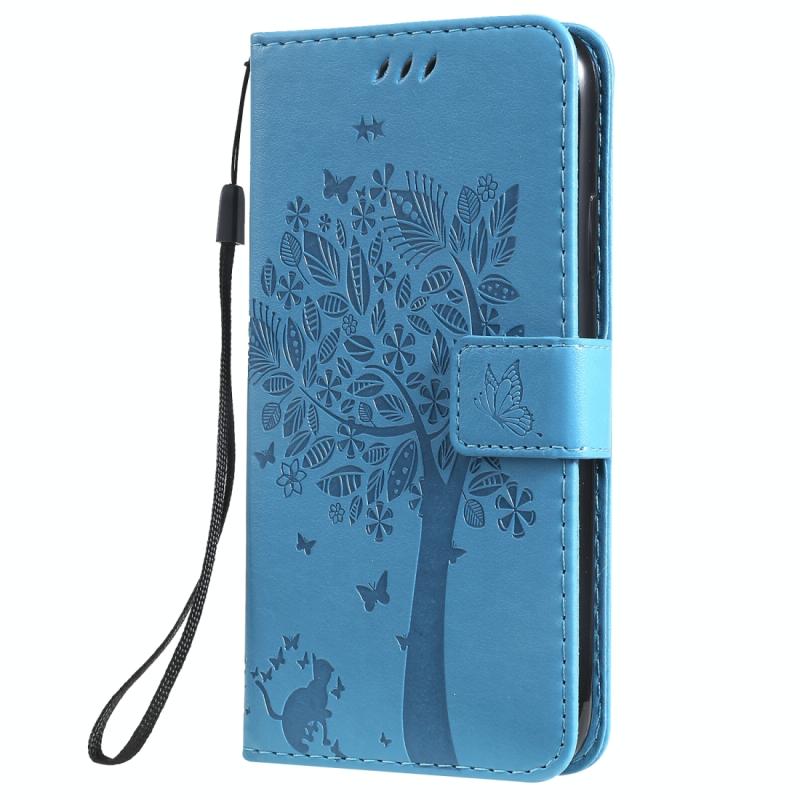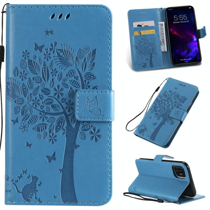 For iPhone 11 Tree & Cat Pattern Pressed Printing Horizontal Flip PU Leather Case with Holder & Card Slots & Wallet & Lanyard (Blue)