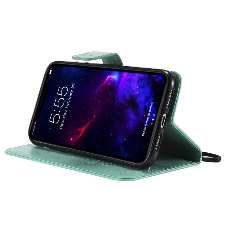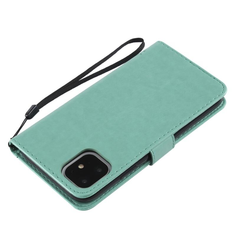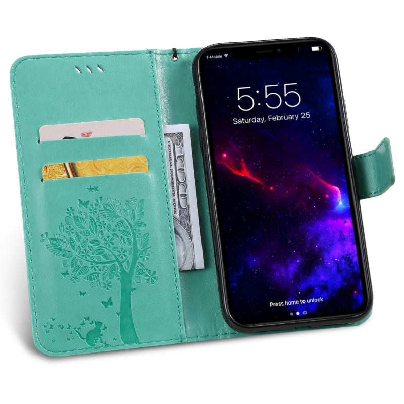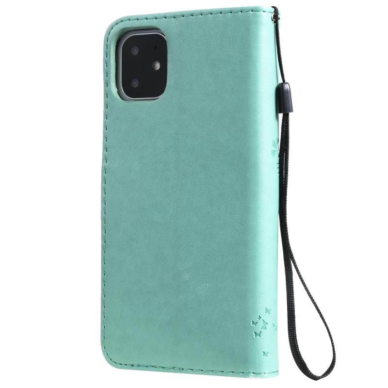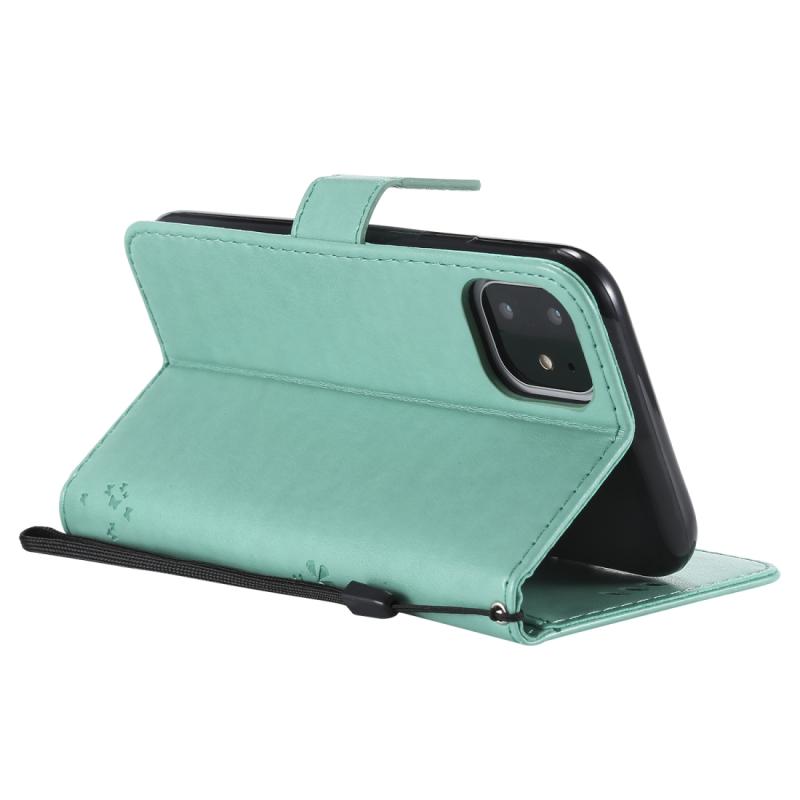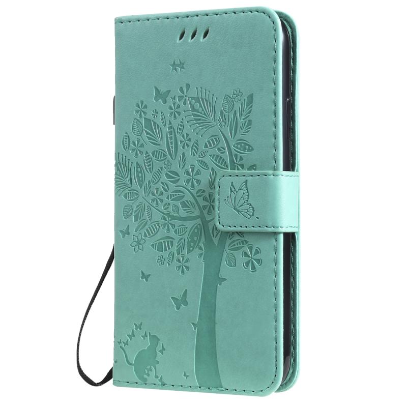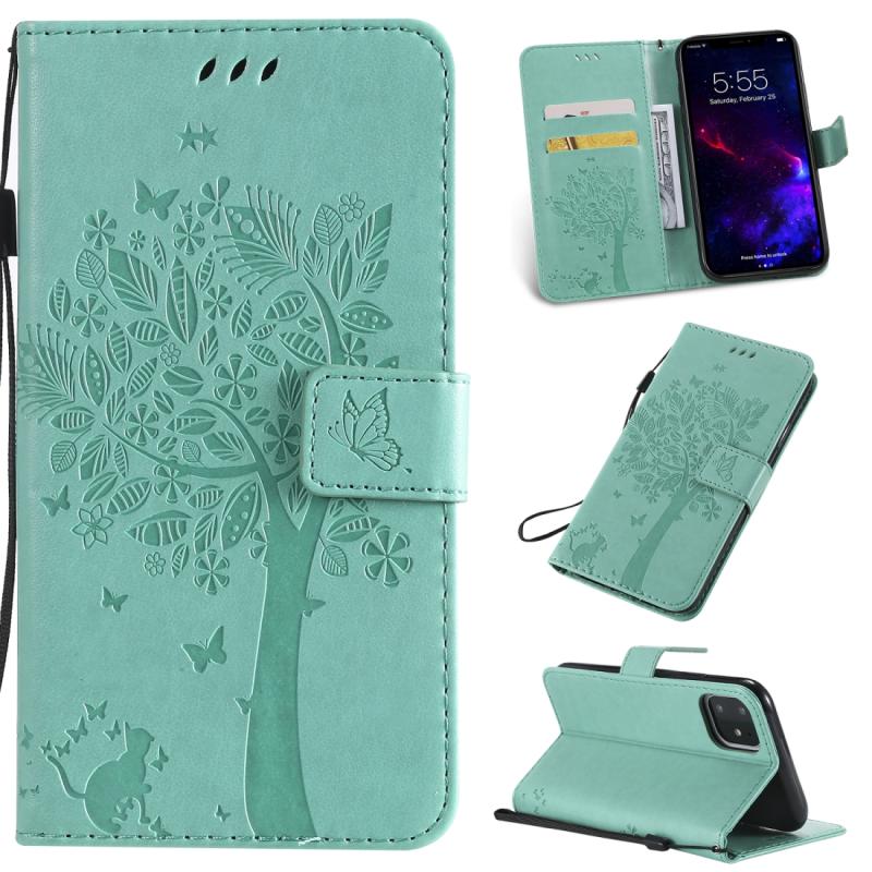 For iPhone 11 Tree & Cat Pattern Pressed Printing Horizontal Flip PU Leather Case with Holder & Card Slots & Wallet & Lanyard (Green)