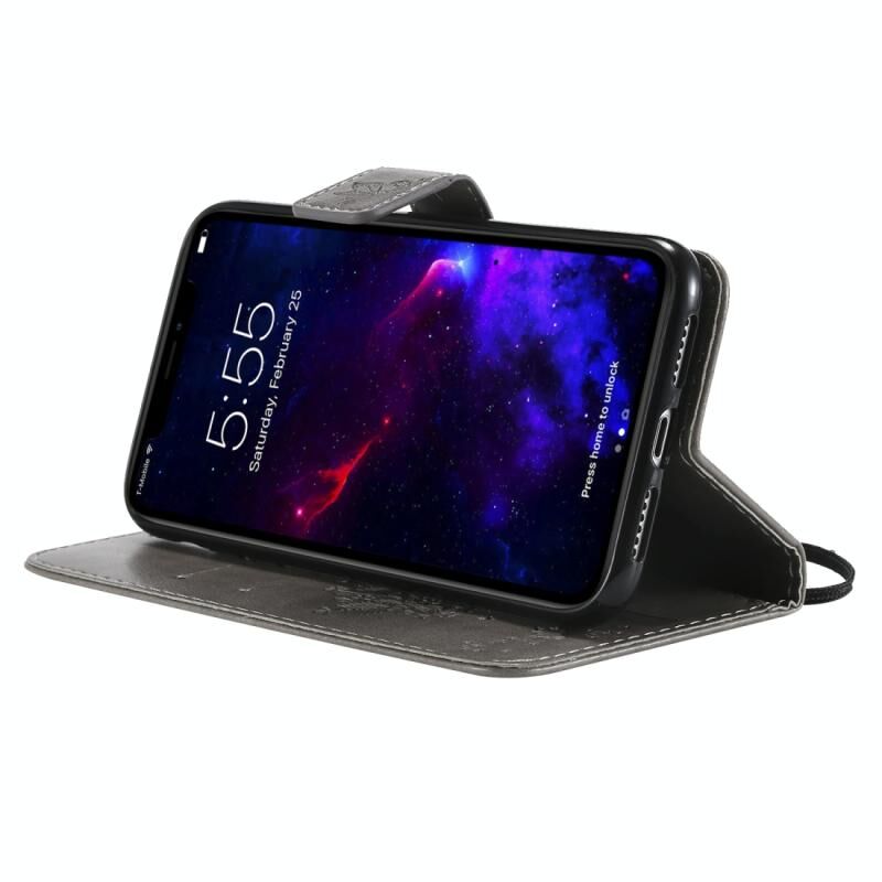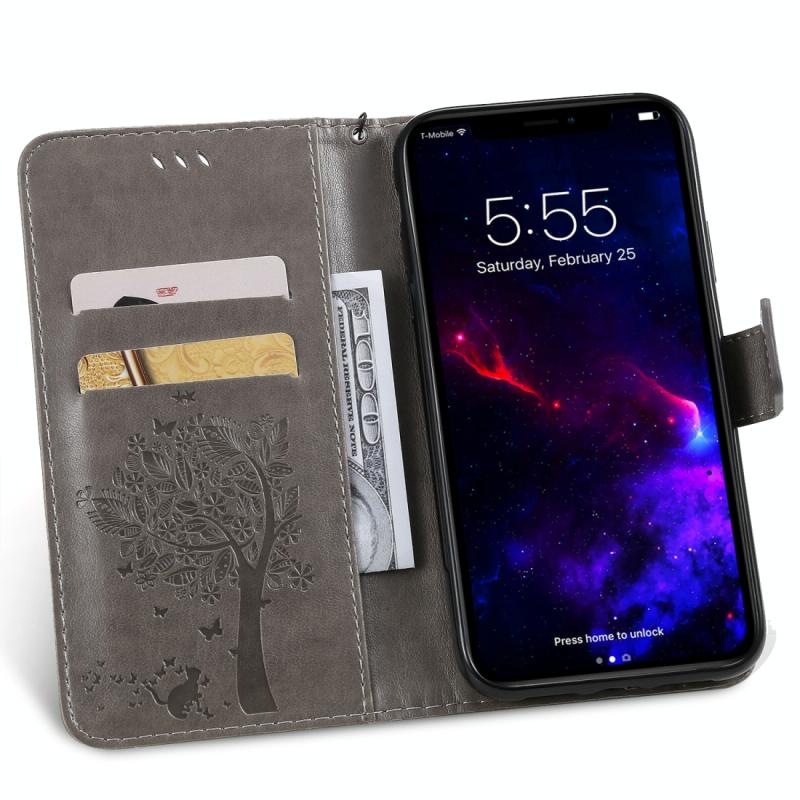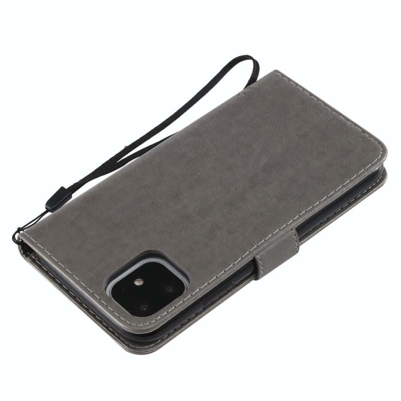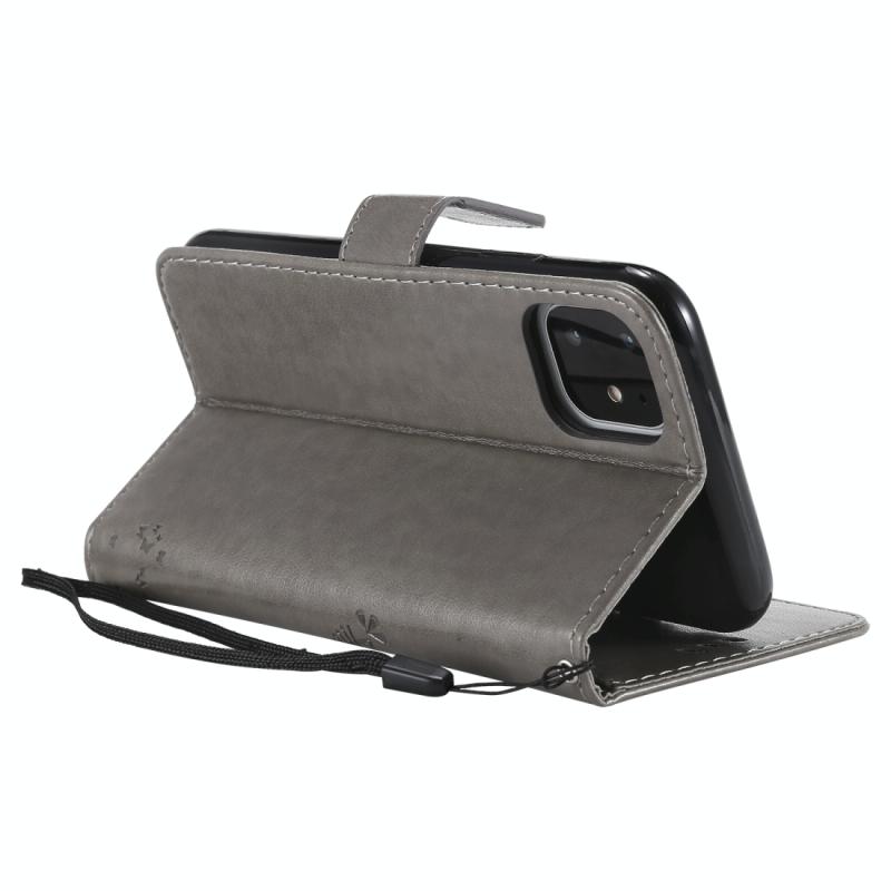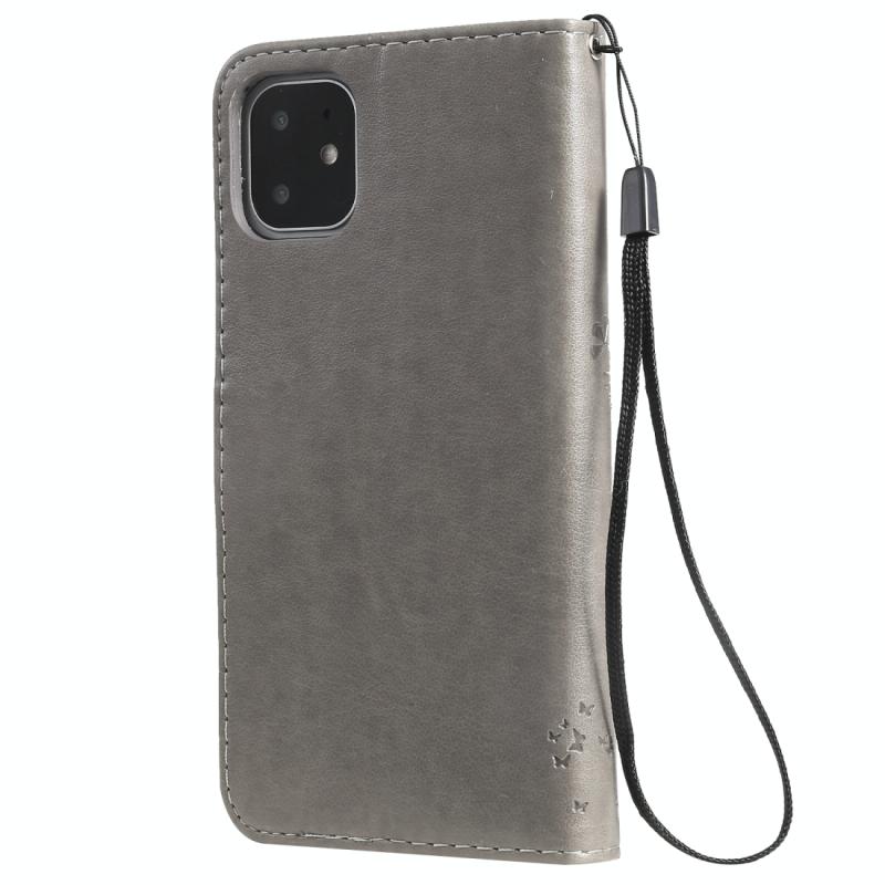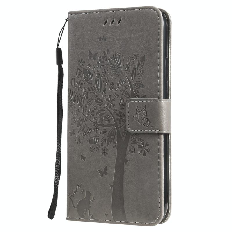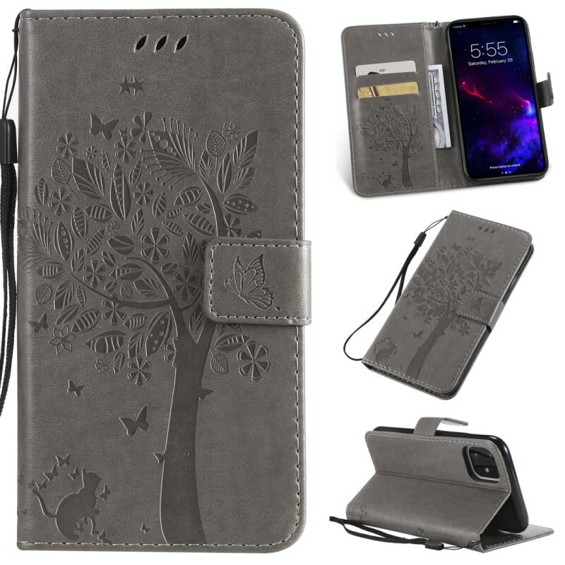 For iPhone 11 Tree & Cat Pattern Pressed Printing Horizontal Flip PU Leather Case with Holder & Card Slots & Wallet & Lanyard (Grey)