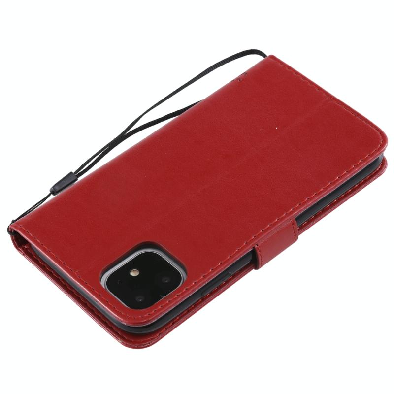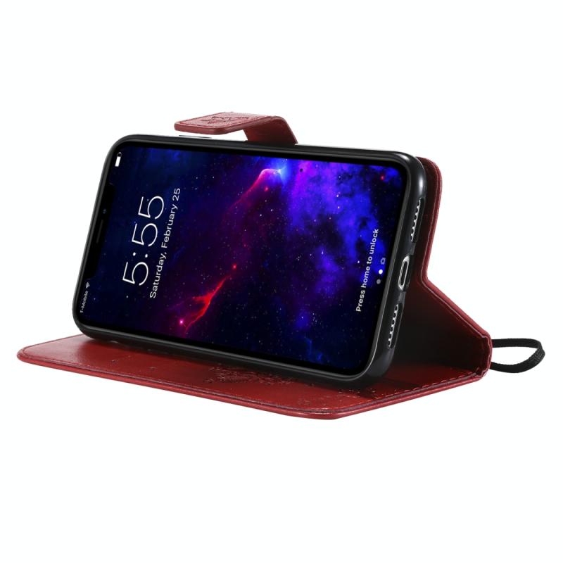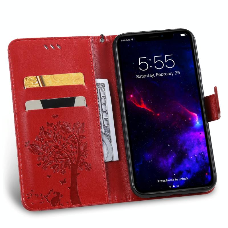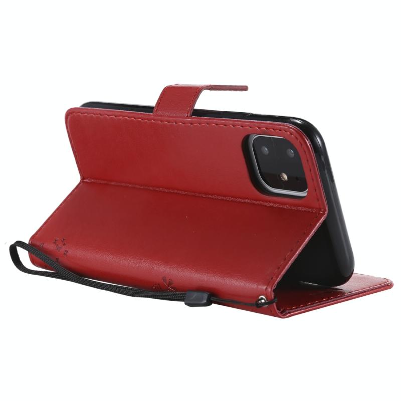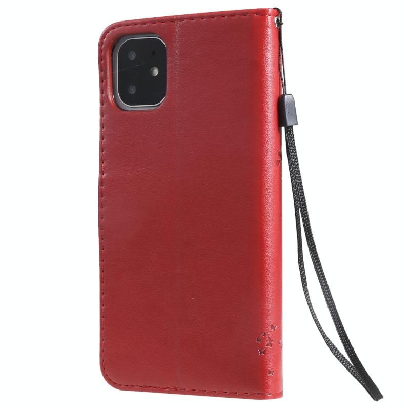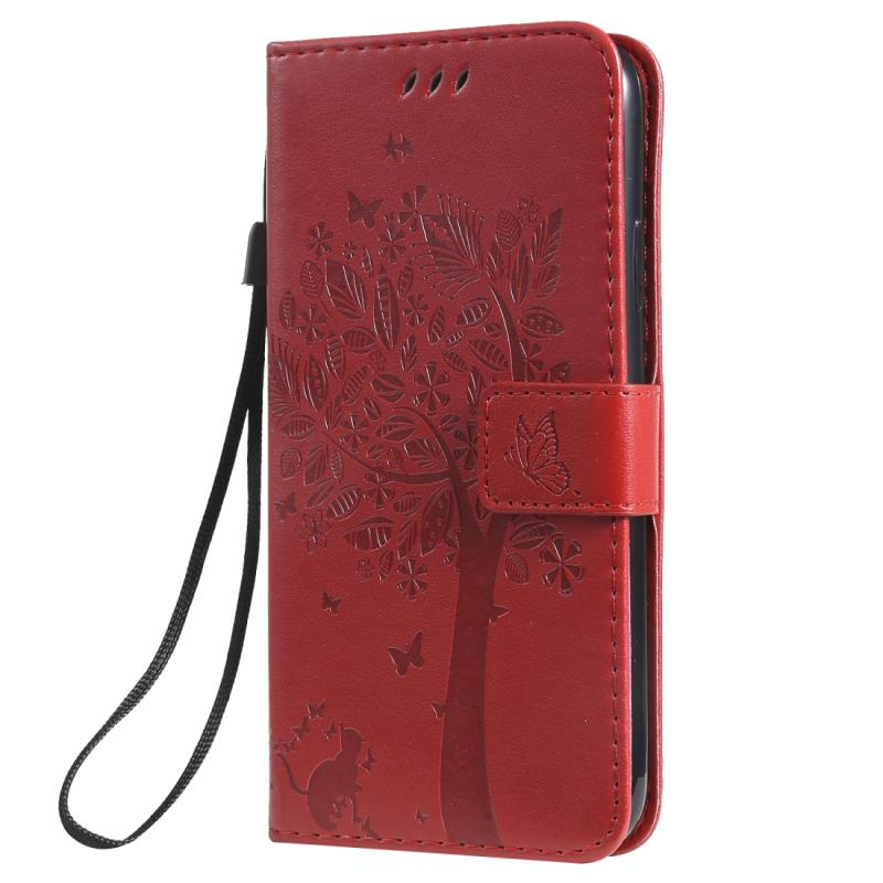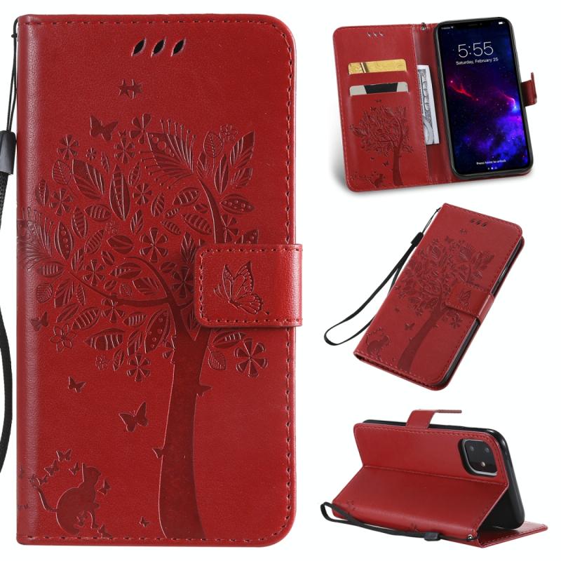For iPhone 11 Tree & Cat Pattern Pressed Printing Horizontal Flip PU Leather Case with Holder & Card Slots & Wallet & Lanyard (Red)