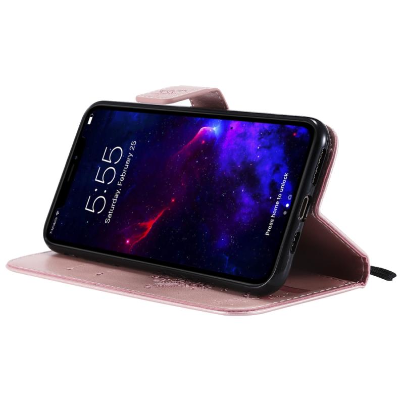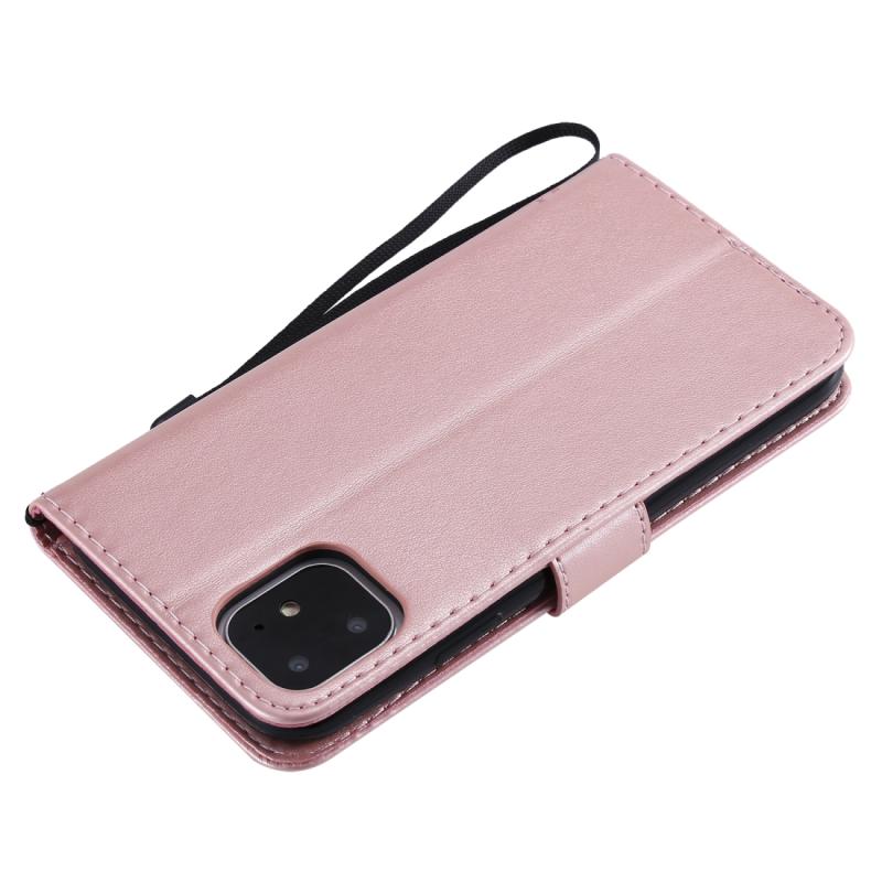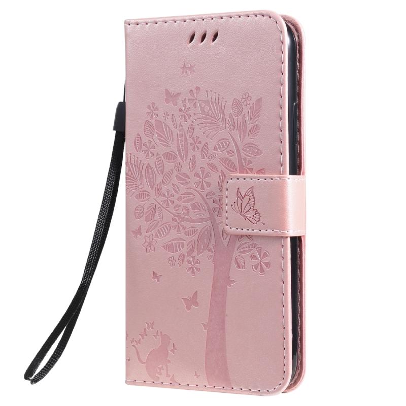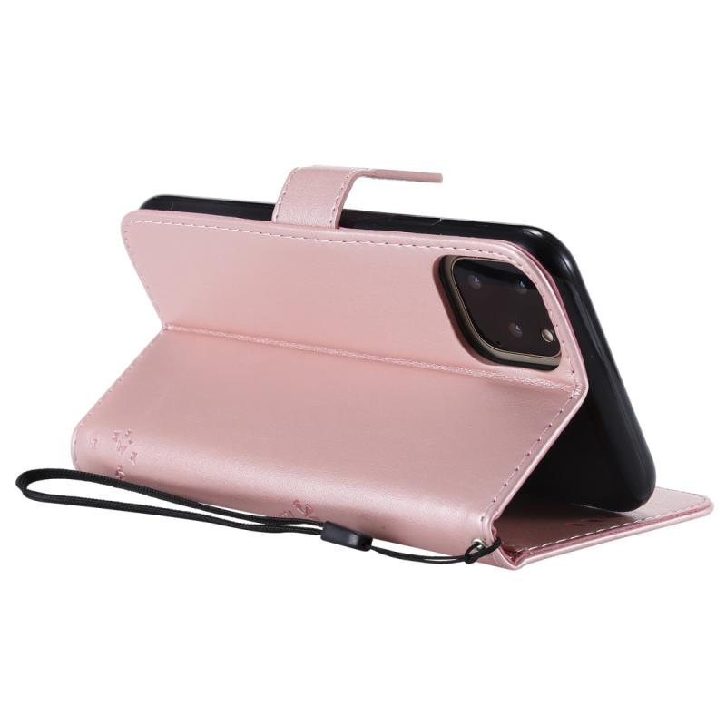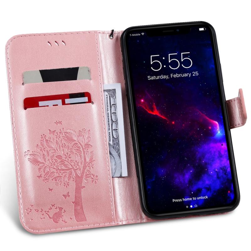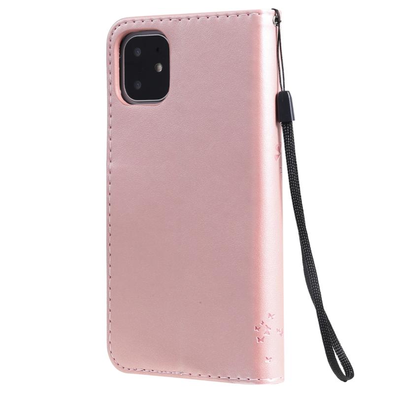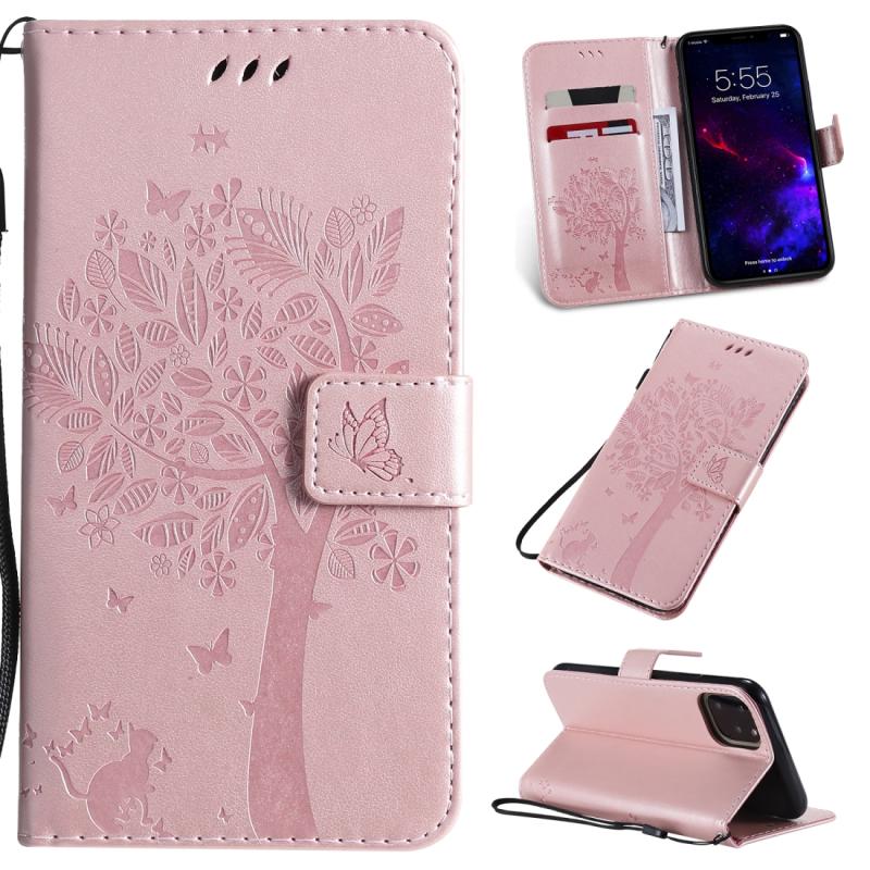 For iPhone 11 Tree & Cat Pattern Pressed Printing Horizontal Flip PU Leather Case with Holder & Card Slots & Wallet & Lanyard (Rose Gold)