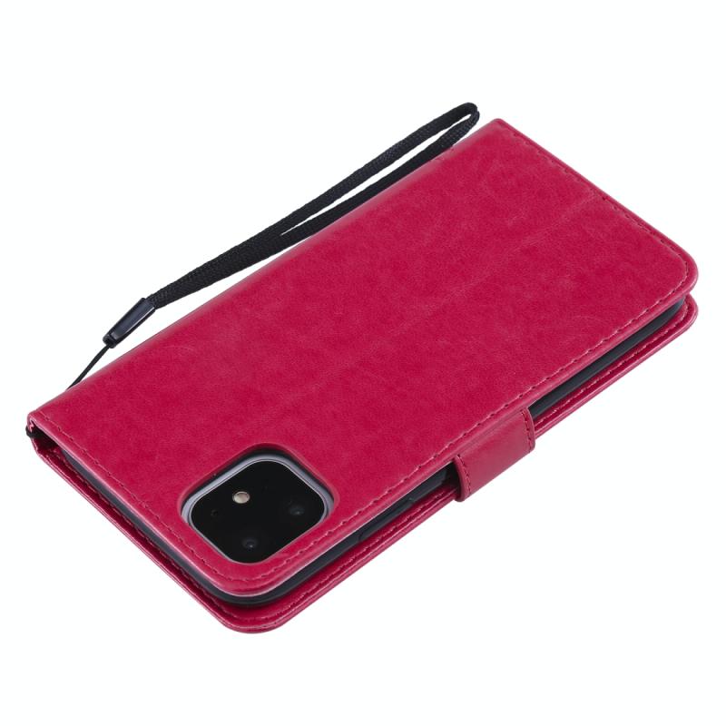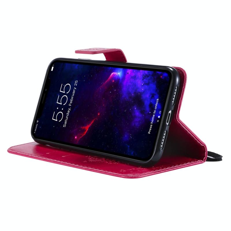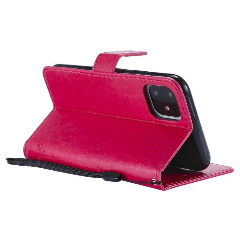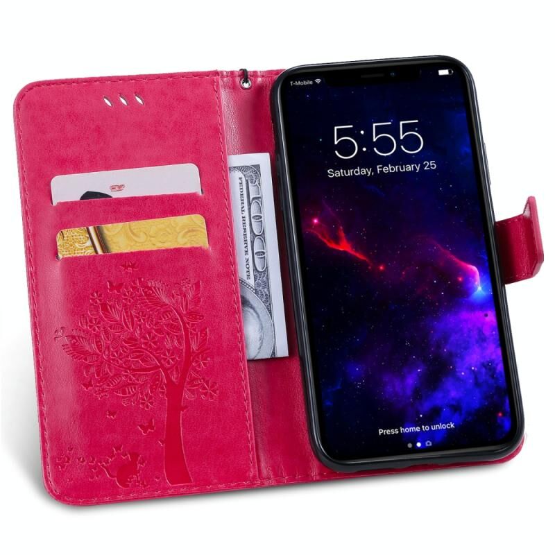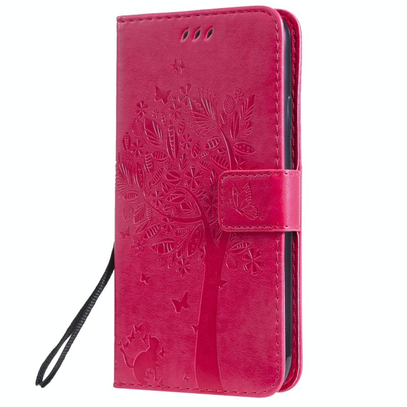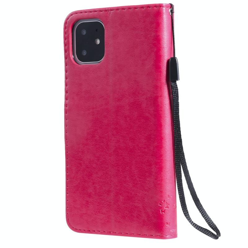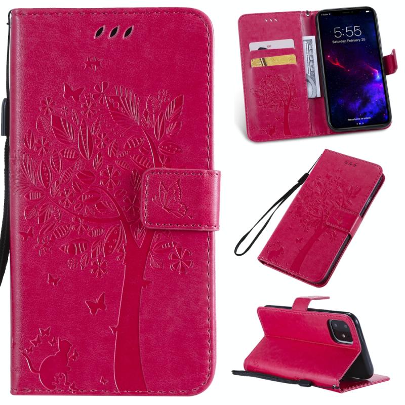 For iPhone 11 Tree & Cat Pattern Pressed Printing Horizontal Flip PU Leather Case with Holder & Card Slots & Wallet & Lanyard (Rose Red)