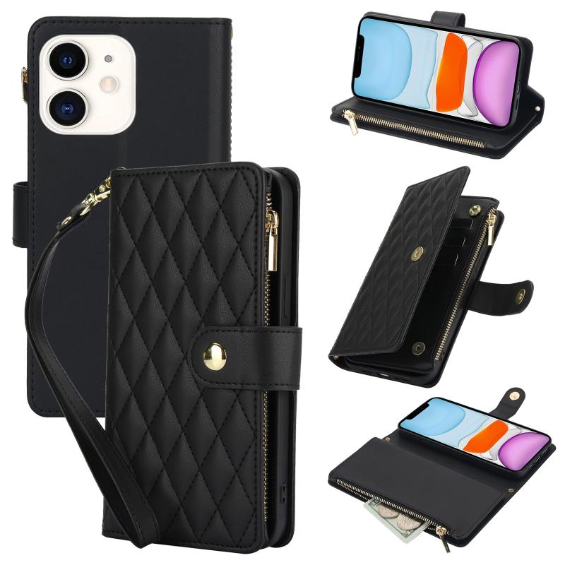 For iPhone 11 YM016 Rhombic Zipper Card Wallet Leather Phone Case with Lanyard(Black)