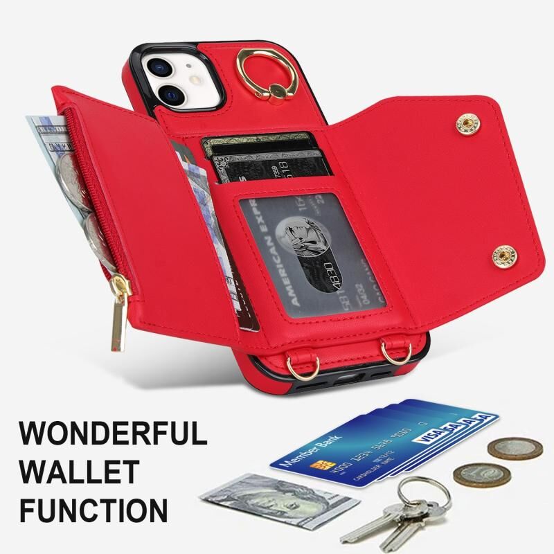 For iPhone 11 Zipper Card Bag Phone Case with Dual Lanyard(Red)
