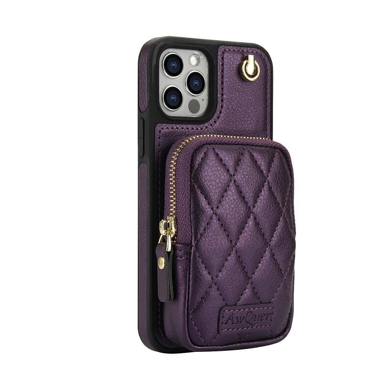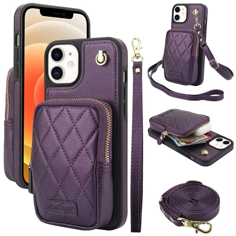 For iPhone 12 / 12 Pro AwQuer Crossbody Zipper Wallet Bag Litchi Leather Phone Case(Dark Purple) (Awquer)