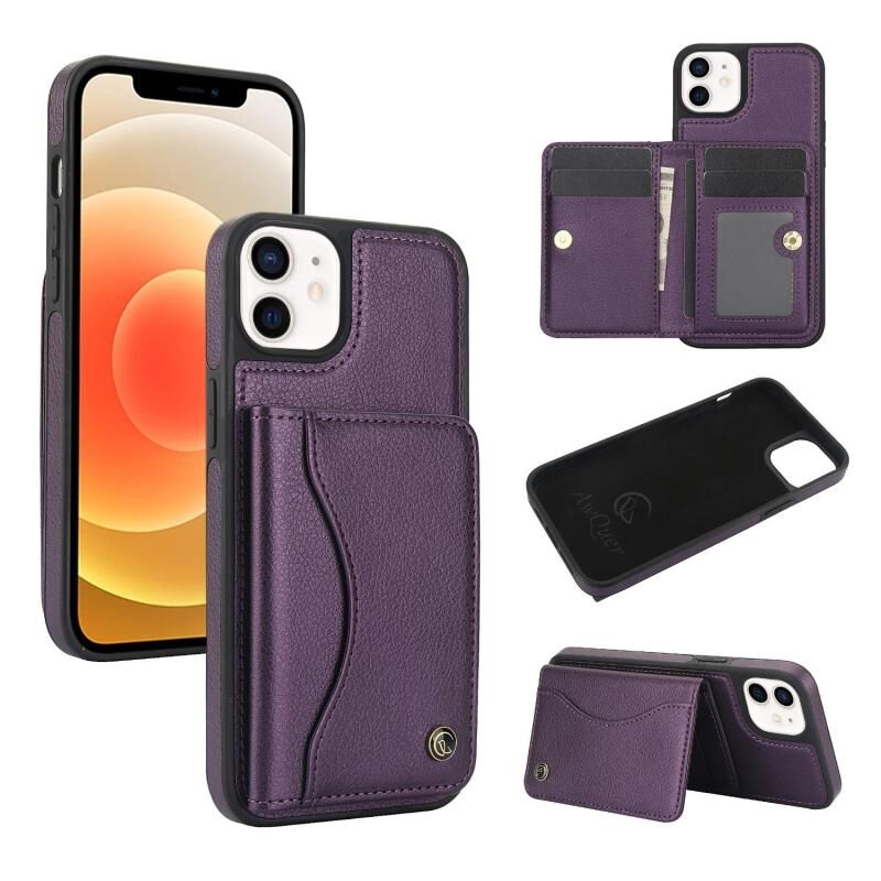 For iPhone 12 / 12 Pro AwQuer Horizontal Flip Card Bag Holder Leather Phone Case(Dark Purple) (Awquer)