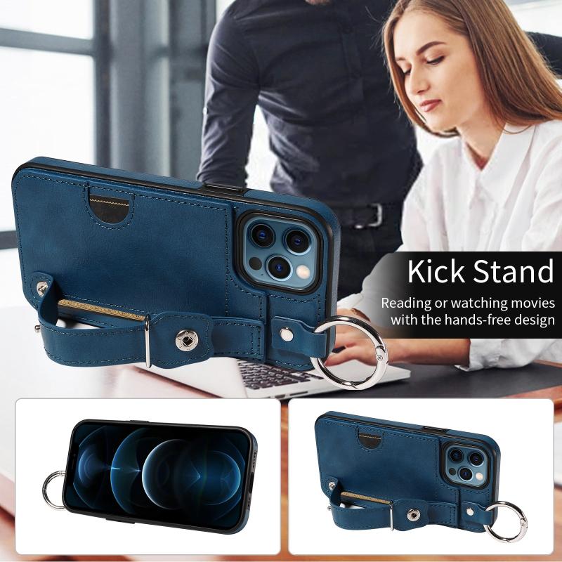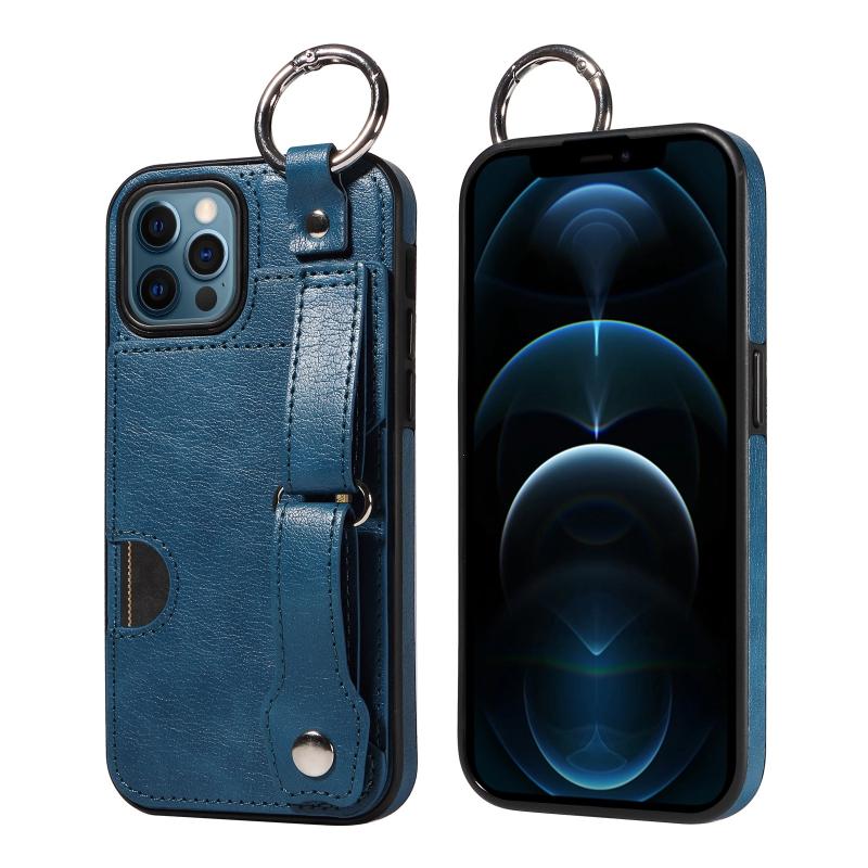 For iPhone 12 / 12 Pro Calf Texture Wrist Card Slot Ring Phone Case(Blue)