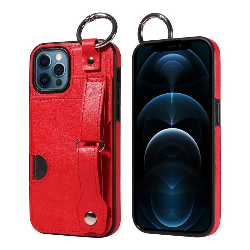 For iPhone 12 / 12 Pro Calf Texture Wrist Card Slot Ring Phone Case(Red)