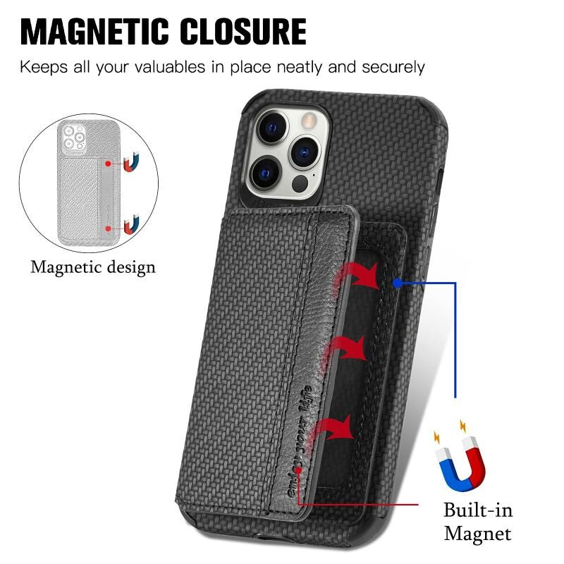 Θήκη για iPhone 12 / 12 Pro από ανθρακονήματα με μαγνητική θήκη καρτών, TPU+PU αντικραδασμική προστασία πλάτης με βάση στήριξης & υποδοχή καρτών & κορνίζα φωτογραφιών (Μαύρο)