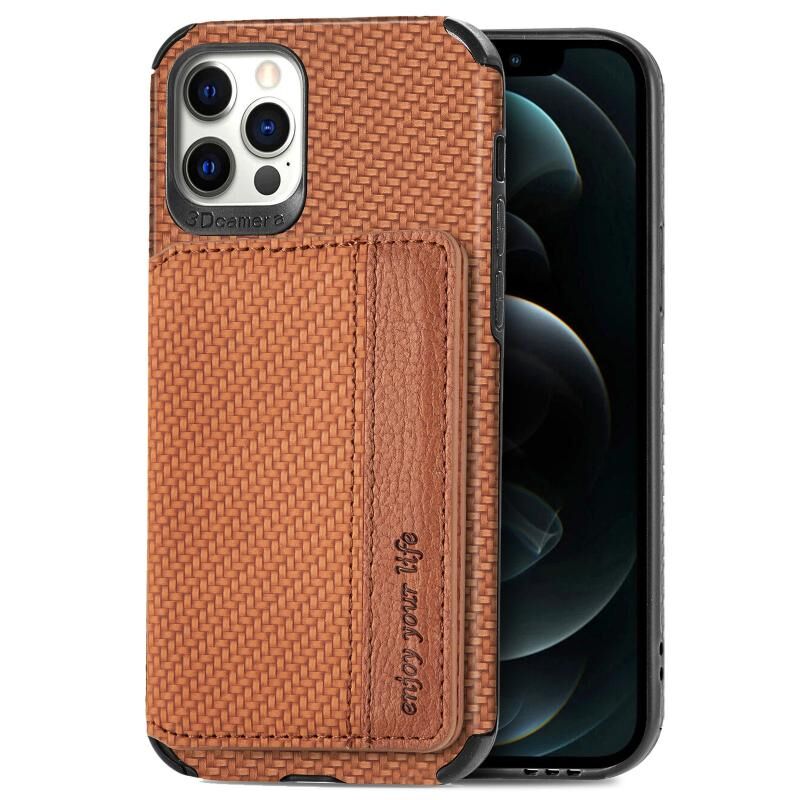 Θήκη για iPhone 12 / 12 Pro από ανθρακονήματα με μαγνητική θήκη καρτών, TPU+PU αντικραδασμική προστασία πλάτης με βάση στήριξης & υποδοχή καρτών & κορνίζα φωτογραφιών (Μαύρο)
