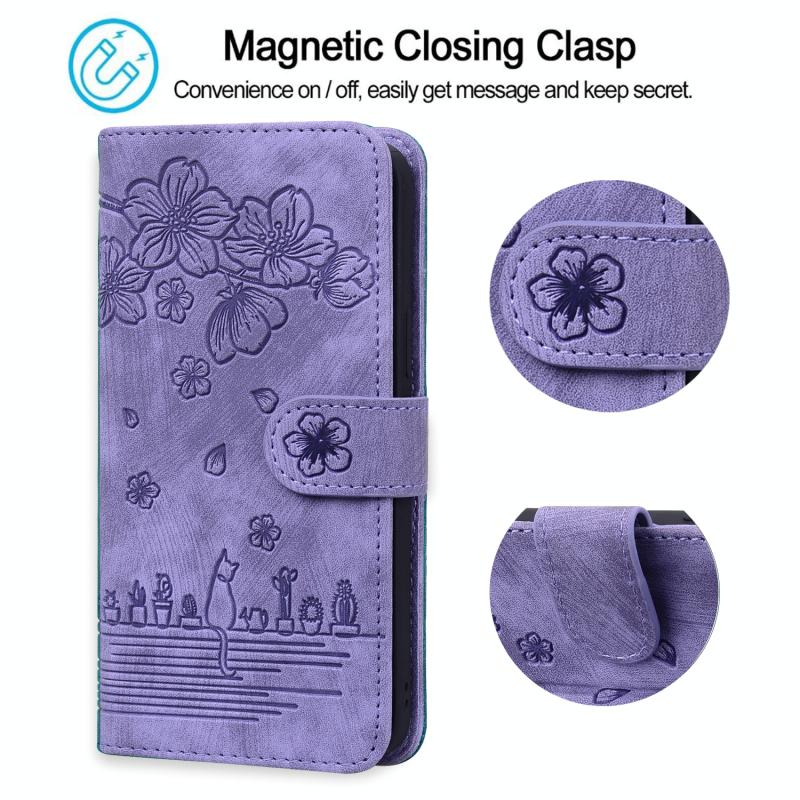 For iPhone 12 / 12 Pro Cartoon Sakura Cat Embossed Leather Case(Purple)