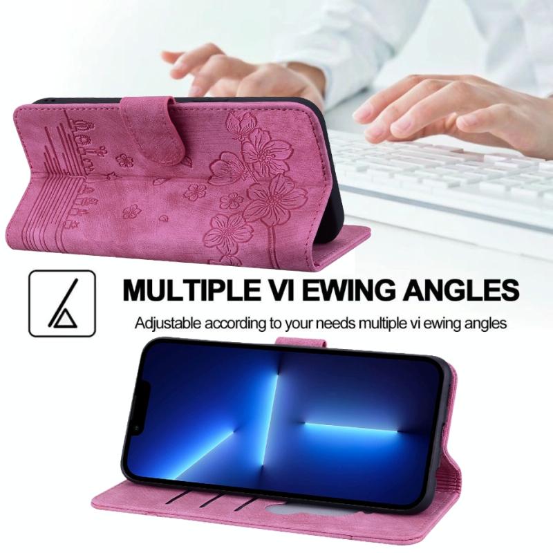 For iPhone 12 / 12 Pro Cartoon Sakura Cat Embossed Leather Case(Rose Red)