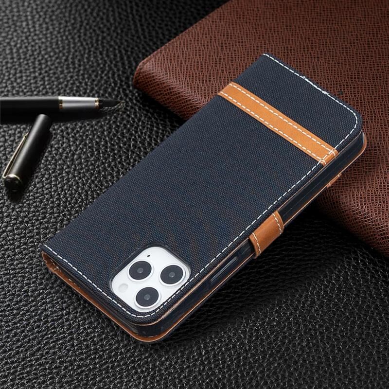 Θήκη δέρματος οριζόντιας αναδίπλωσης με υφή τζιν, για iPhone 12 / 12 Pro, σε χρώμα που ταιριάζει, με βάση, θήκες καρτών, πορτοφόλι και κορδόνι (Μωβ)