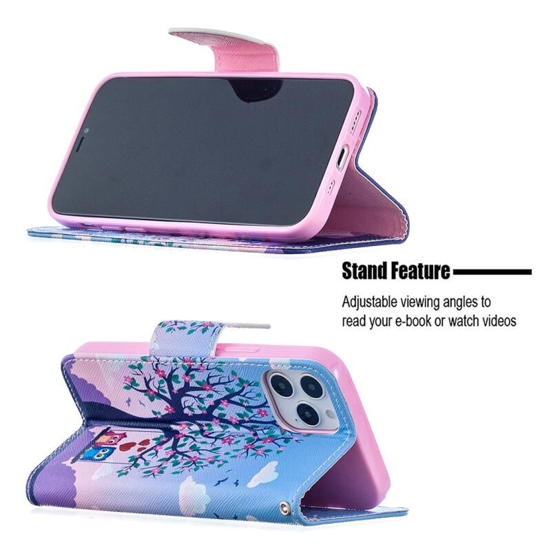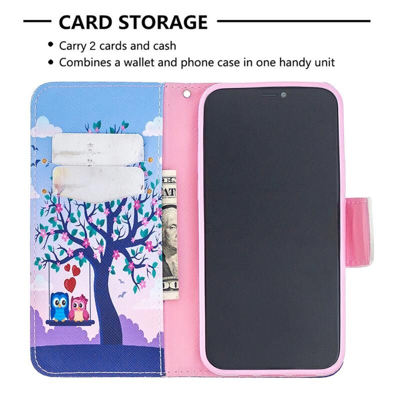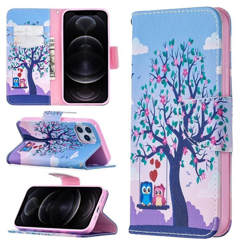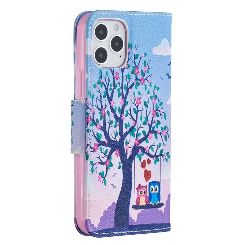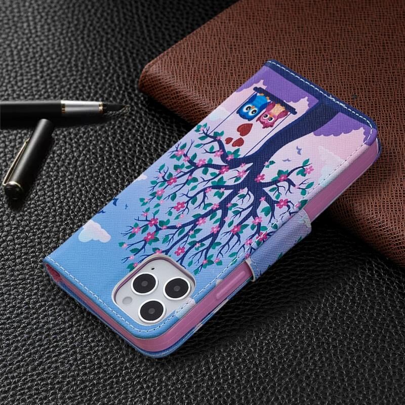 Θήκη δέρματος οριζόντιας αναδίπλωσης με σχέδιο ζωγραφικής σε χρώμα για iPhone 12 / 12 Pro με βάση για κάρτες & θήκη πορτοφολιού (Δύο κουκουβάγιες)