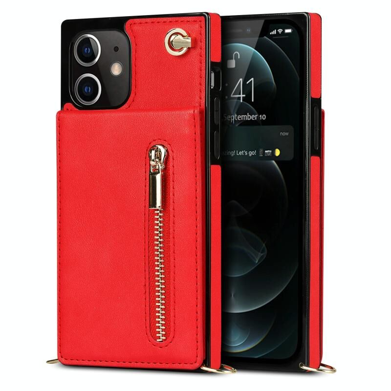 For iPhone 12 / 12 Pro Cross-body Zipper Square TPU+PU Back Cover Case with Holder & Card Slots & Wallet & Strap(Red)