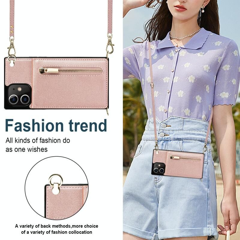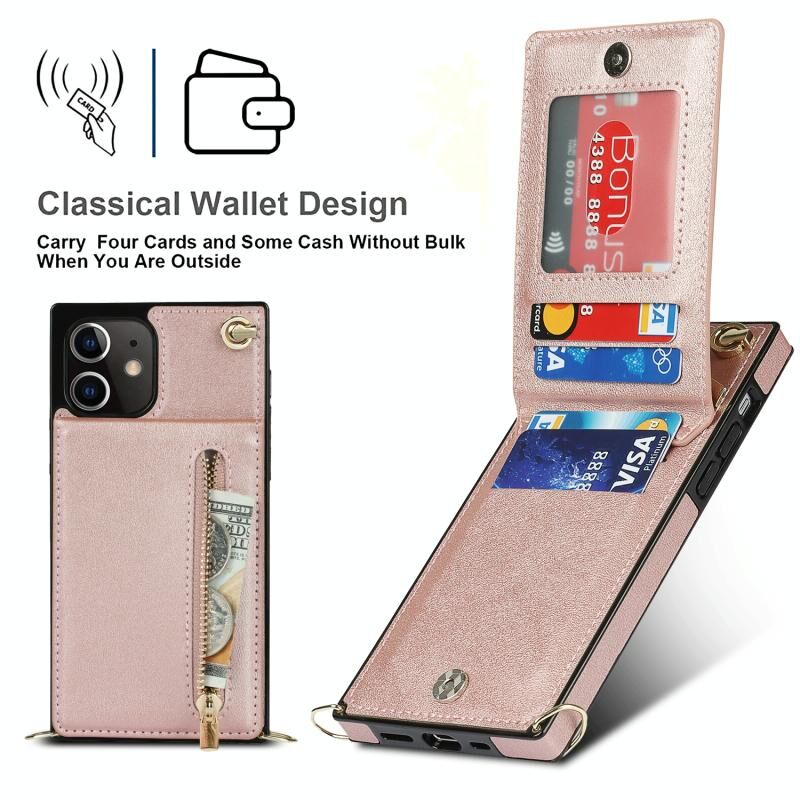 For iPhone 12 / 12 Pro Cross-body Zipper Square TPU+PU Back Cover Case with Holder & Card Slots & Wallet & Strap(Rose Gold)