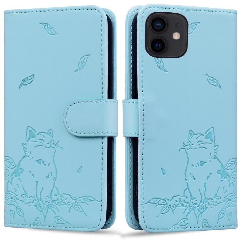 For iPhone 12 / 12 Pro Cute Cat Embossed Leather Phone Case(Sky Blue)