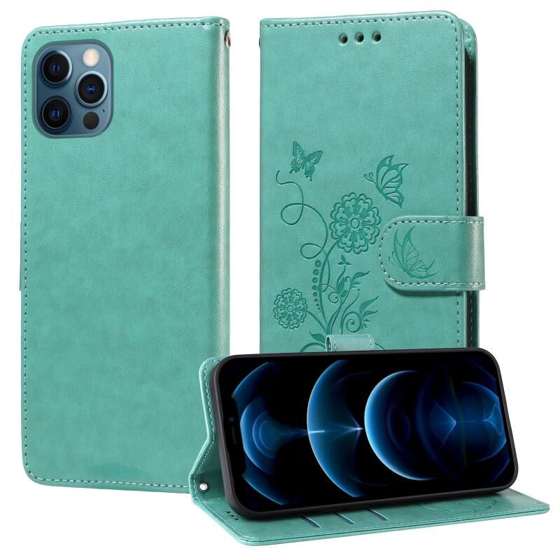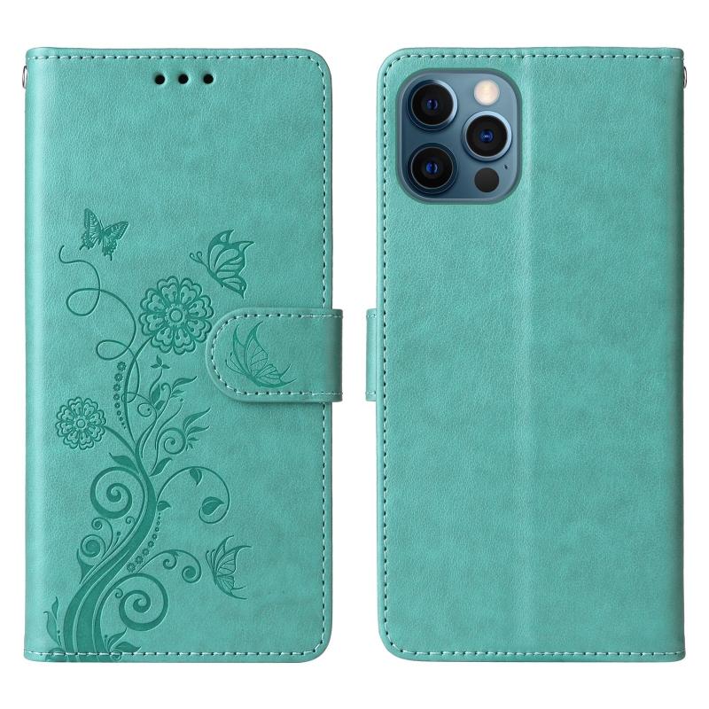 For iPhone 12 / 12 Pro Embossed Butterfly Flowers Leather Phone Case(Green)