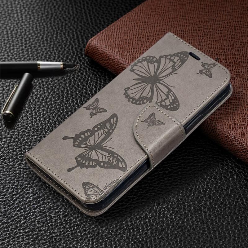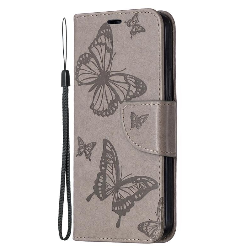 Θήκη για iPhone 12 / 12 Pro με ανάγλυφο σχέδιο δύο πεταλούδων, οριζόντια, από δερματίνη PU με βάση στήριξης & θήκη για κάρτες & πορτοφόλι & κορδόνι (Γκρι)
