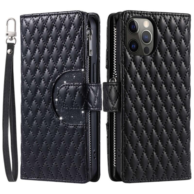 For iPhone 12 / 12 Pro Glitter Lattice Zipper Wallet Leather Phone Case(Black)
