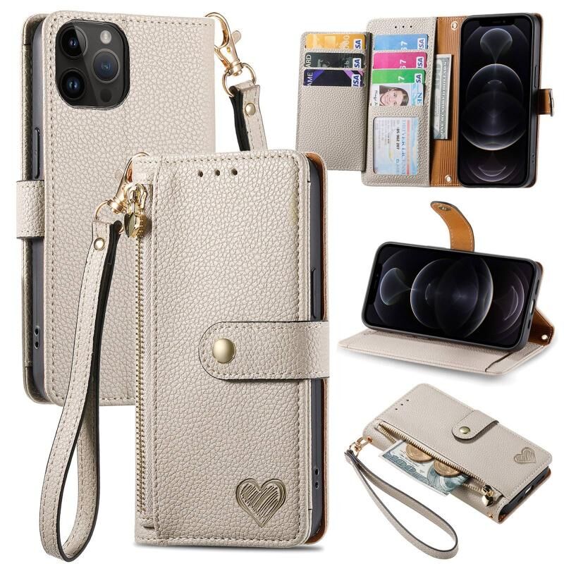 For iPhone 12 / 12 Pro Love Zipper Lanyard Leather Phone Case(Gray)