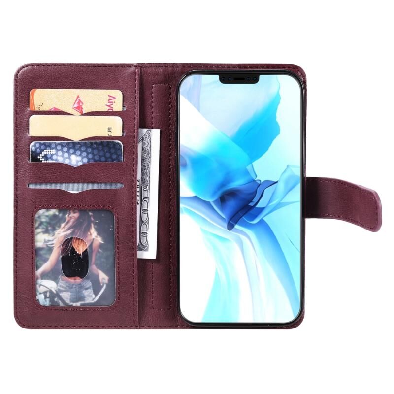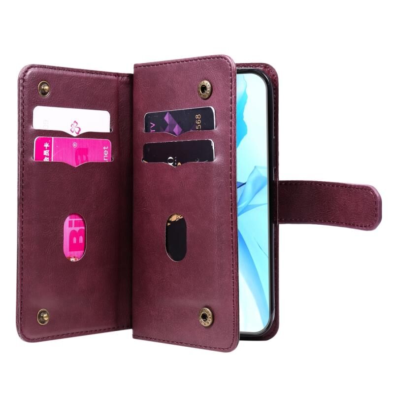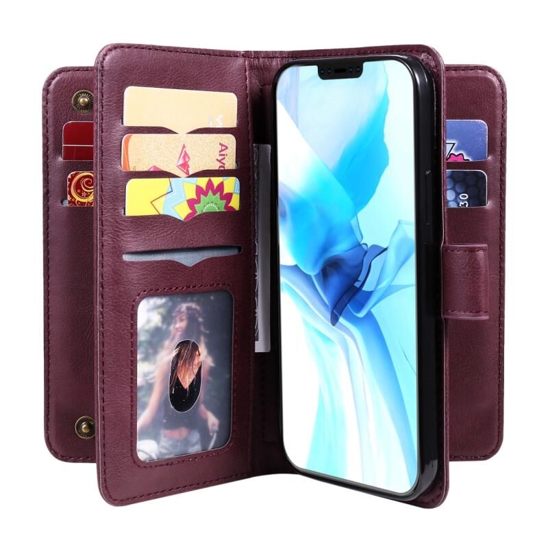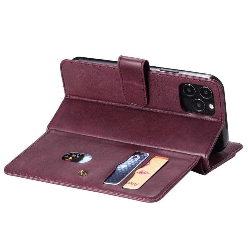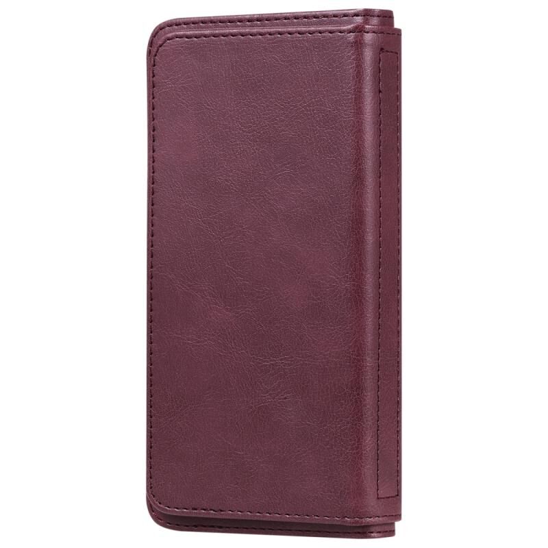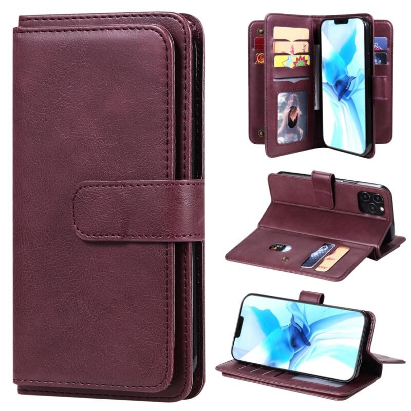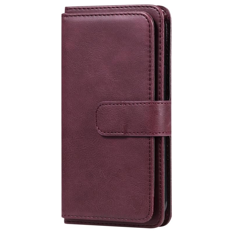 Θήκη για iPhone 12 / 12 Pro, πολυλειτουργική μαγνητική θήκη από δέρμα με οριζόντιο άνοιγμα, μονόχρωμη, με αγκράφα από χαλκό, 10 θέσεις για κάρτες, πορτοφόλι, βάση & κορνίζα φωτογραφιών (Κρασί)
