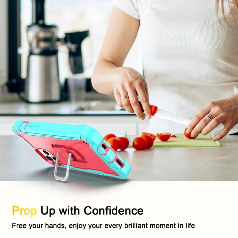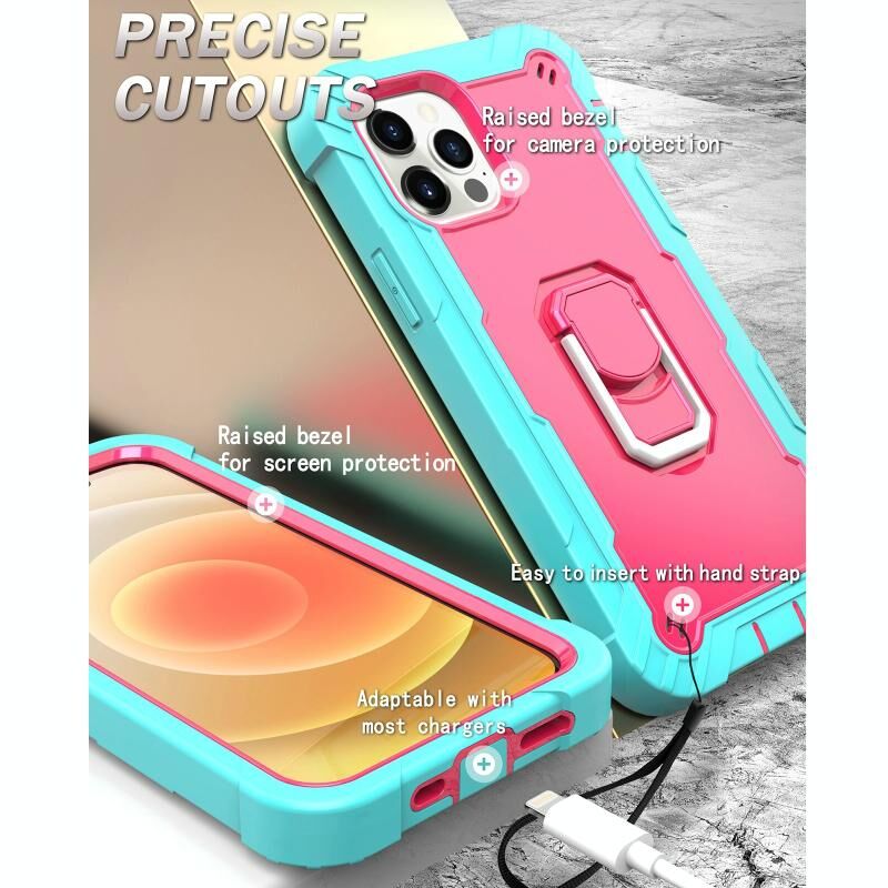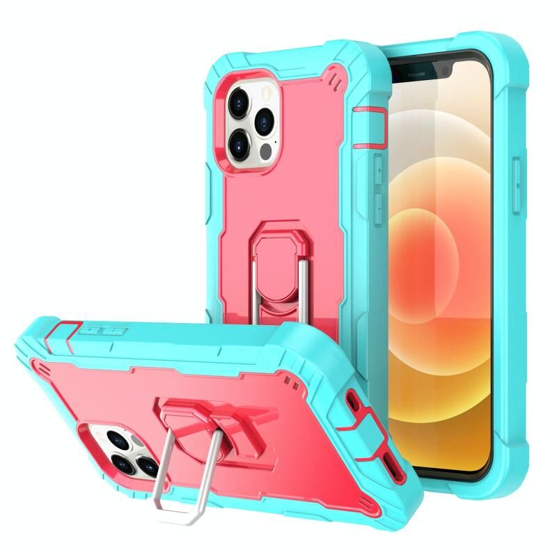 For iPhone 12 / 12 Pro PC + Rubber 3-layers Shockproof Protective Case with Rotating Holder(Mint Green + Rose Red)